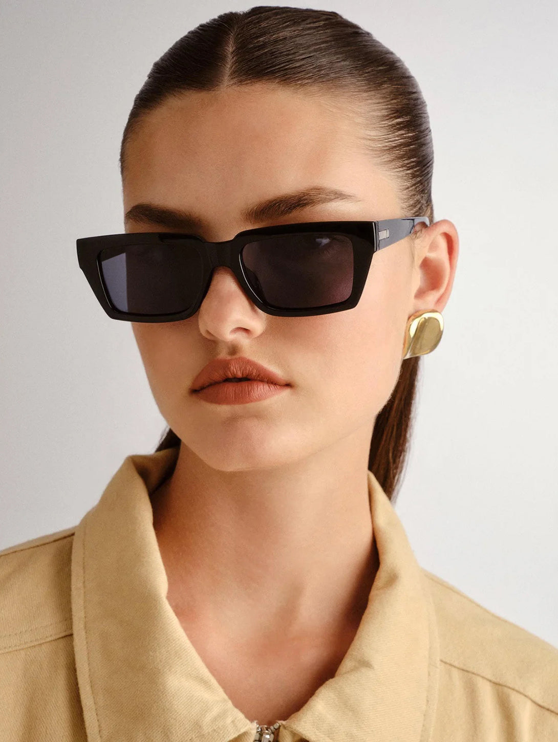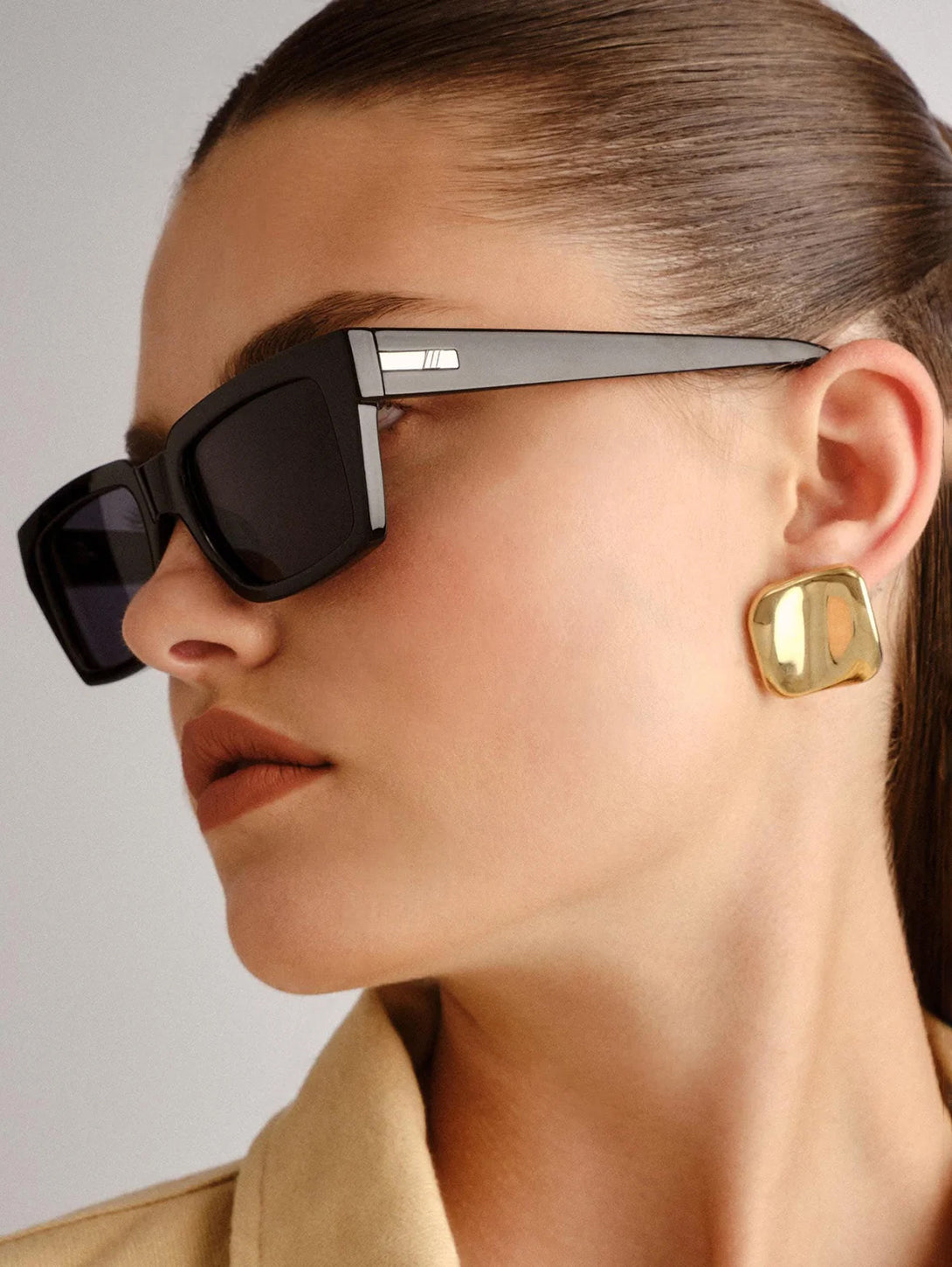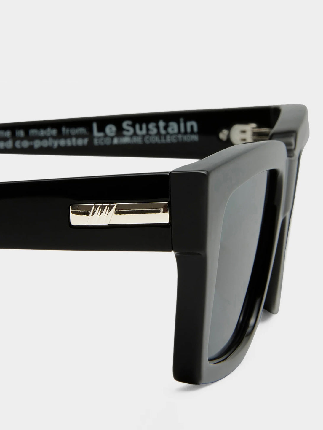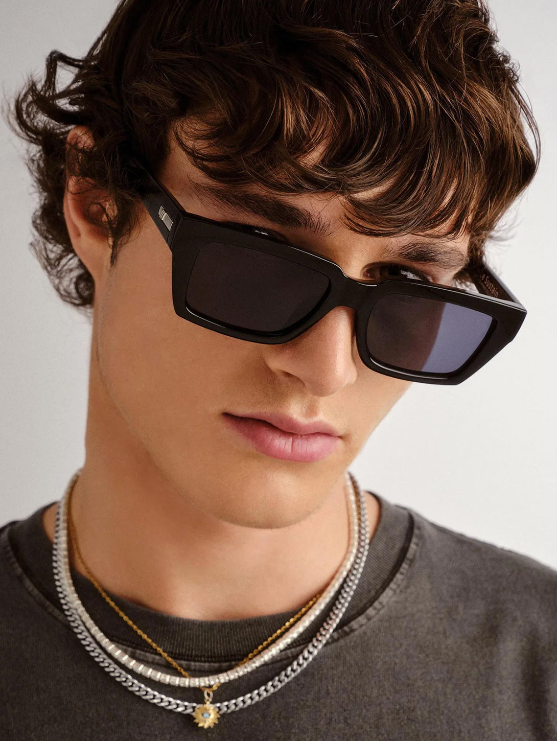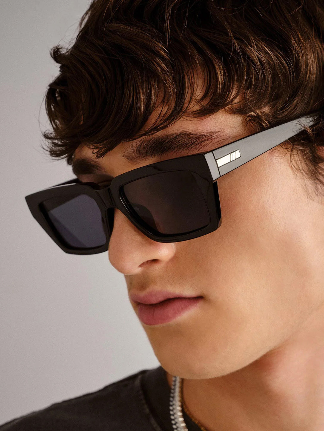 A contemporary update to the classic D-frame, our NOCTURNAL HABIT sunglasses deliver a bold look. With larger proportions and a striking flat frame profile, this pair is accented with horizontal stripe flagstripe hardware and subtle bevel detailing.