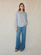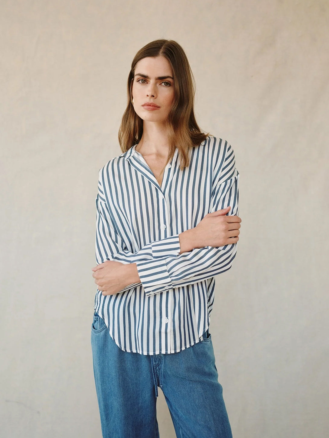This oversized design flows effortlessly over the figure, offering a breezy appearance. The fabric’s rich texture and weight enhance comfort, while the full-button front and polo collar provide adaptable styling options.