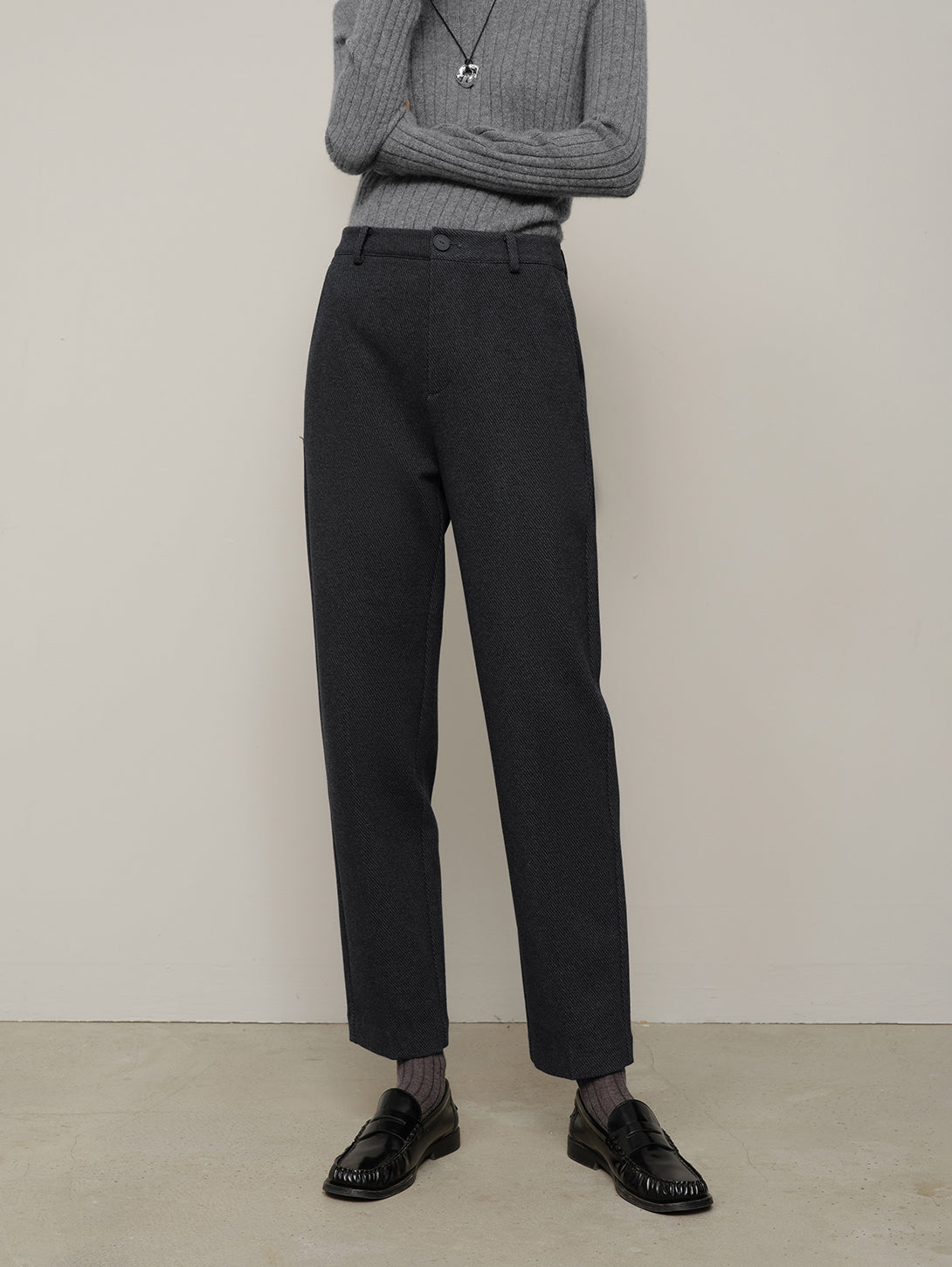 Tailored pants in dark gray with a clean front and cropped hem. The neutral tone balances bold tops or blazers with ease.