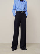 These navy trousers feature precise tailoring and a streamlined waistband. Crafted for both comfort and adaptability, they pair seamlessly with knits, blazers, or tucked-in shirts for a polished look.