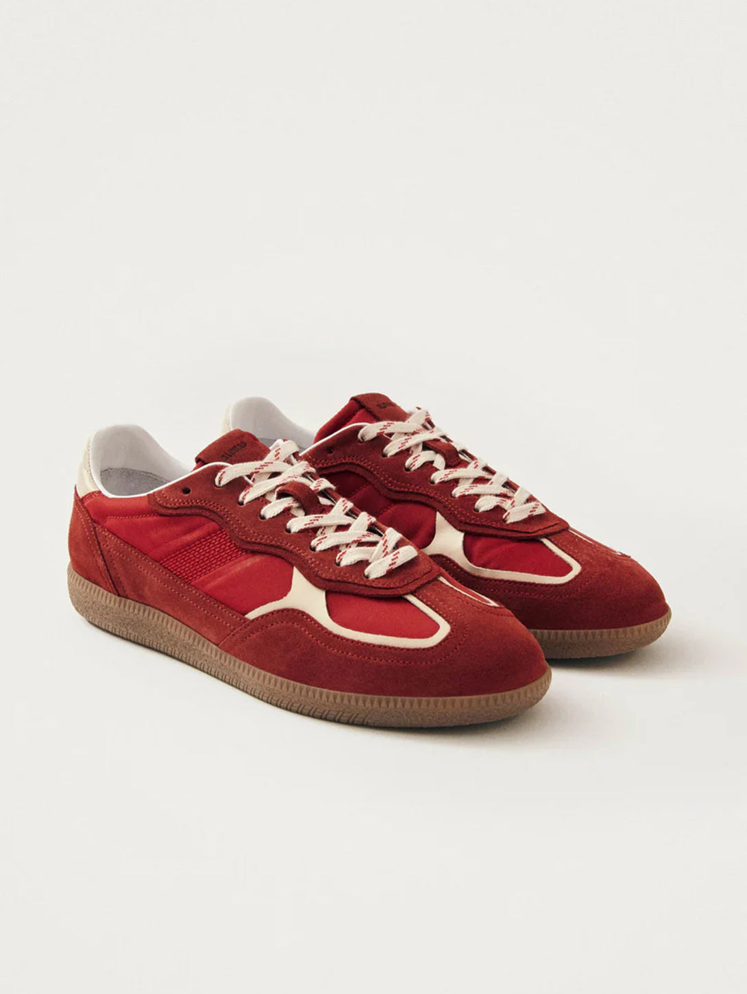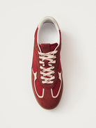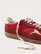 - Red suede and nylon sneakers
