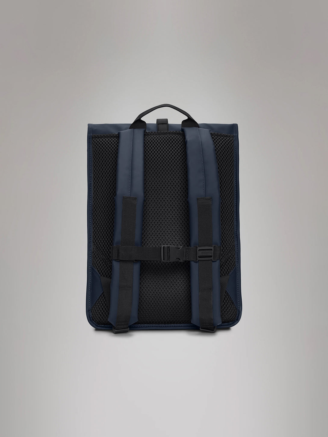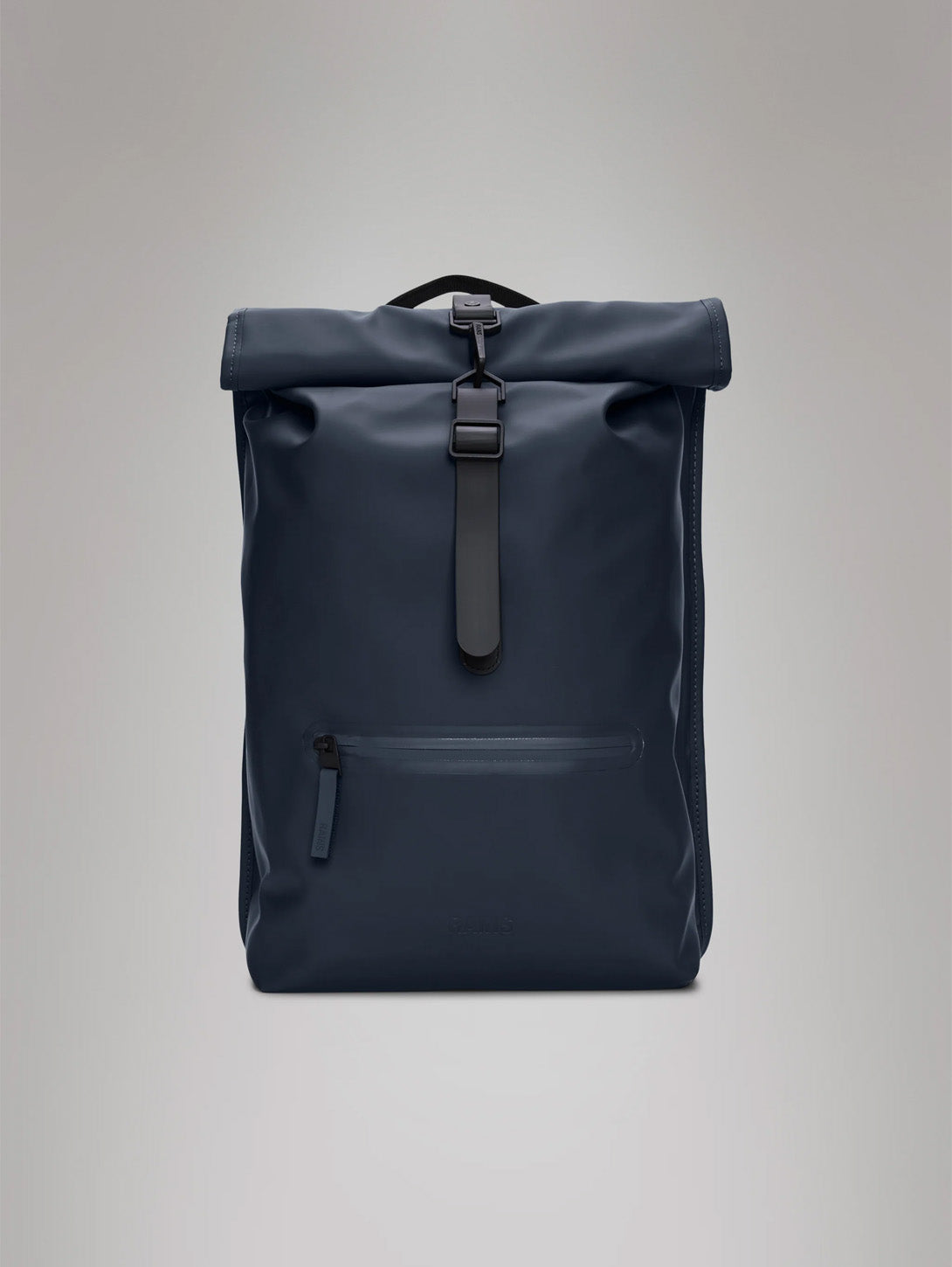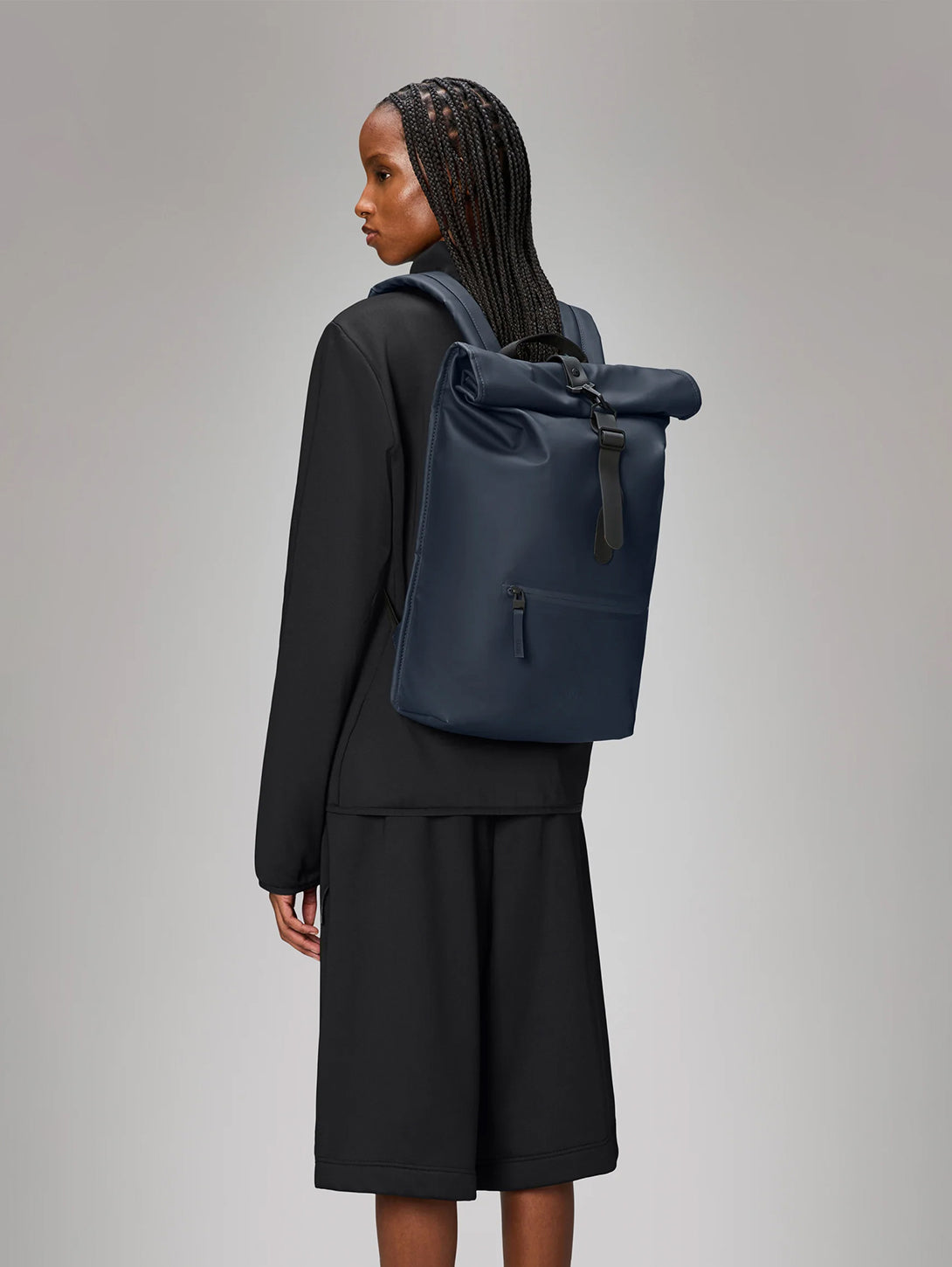 Rolltop Rucksack is cut from Rains' signature PU fabric, engineered for carrying strength, durability and a smooth feel.