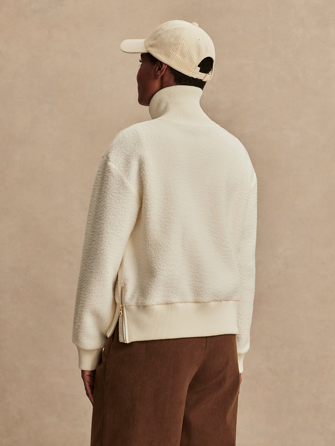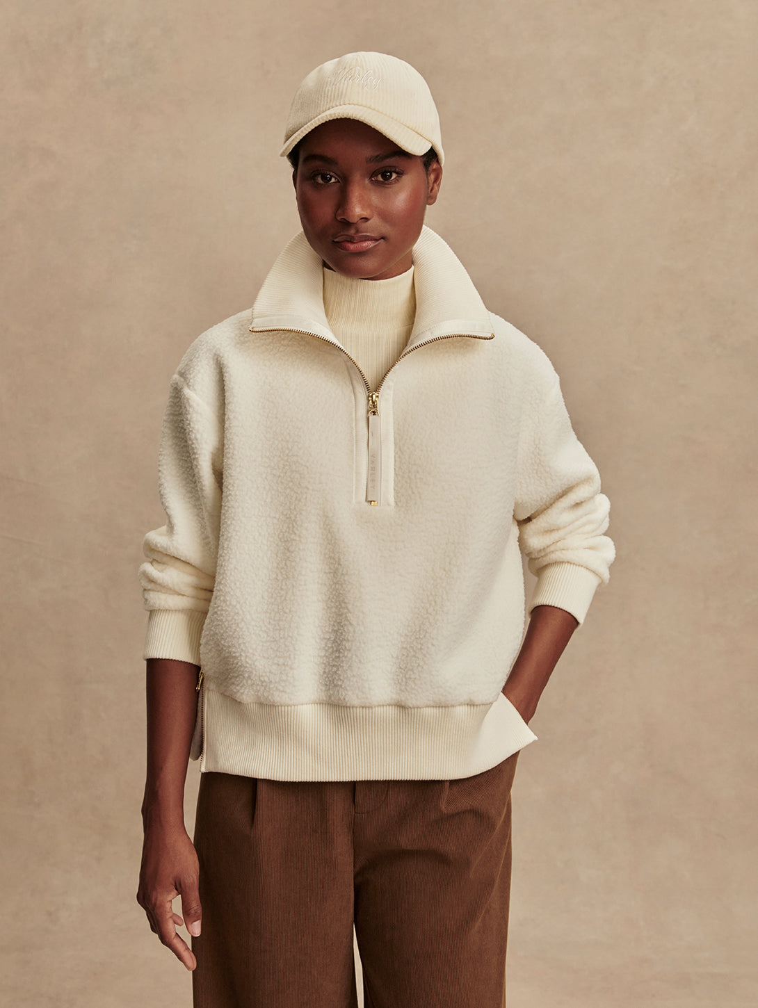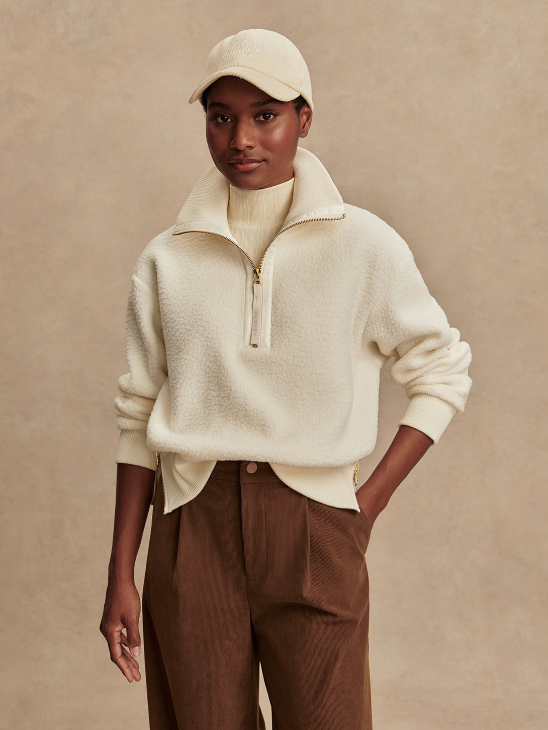 Spotlighting our 100% Recycled Plush Borg Fleece, this style is cut with a half-zip collar, ribbed cuffs and loose fit sleeves. Trademark side zip detailing and a luxe sateen trim elevate the design.