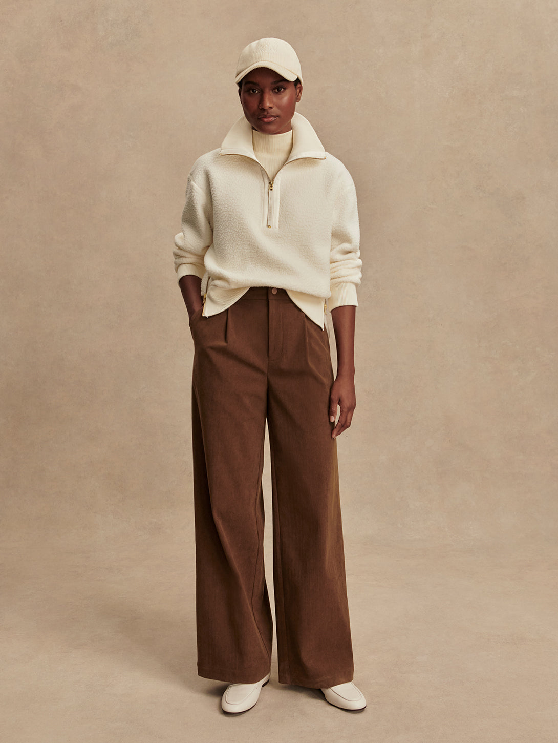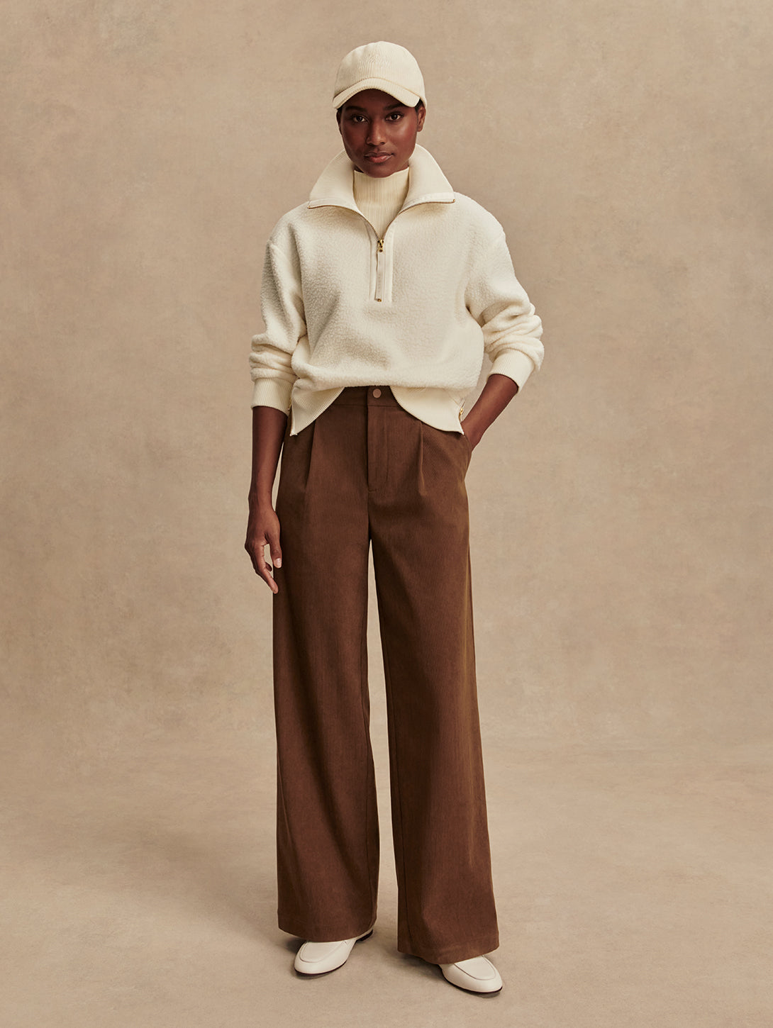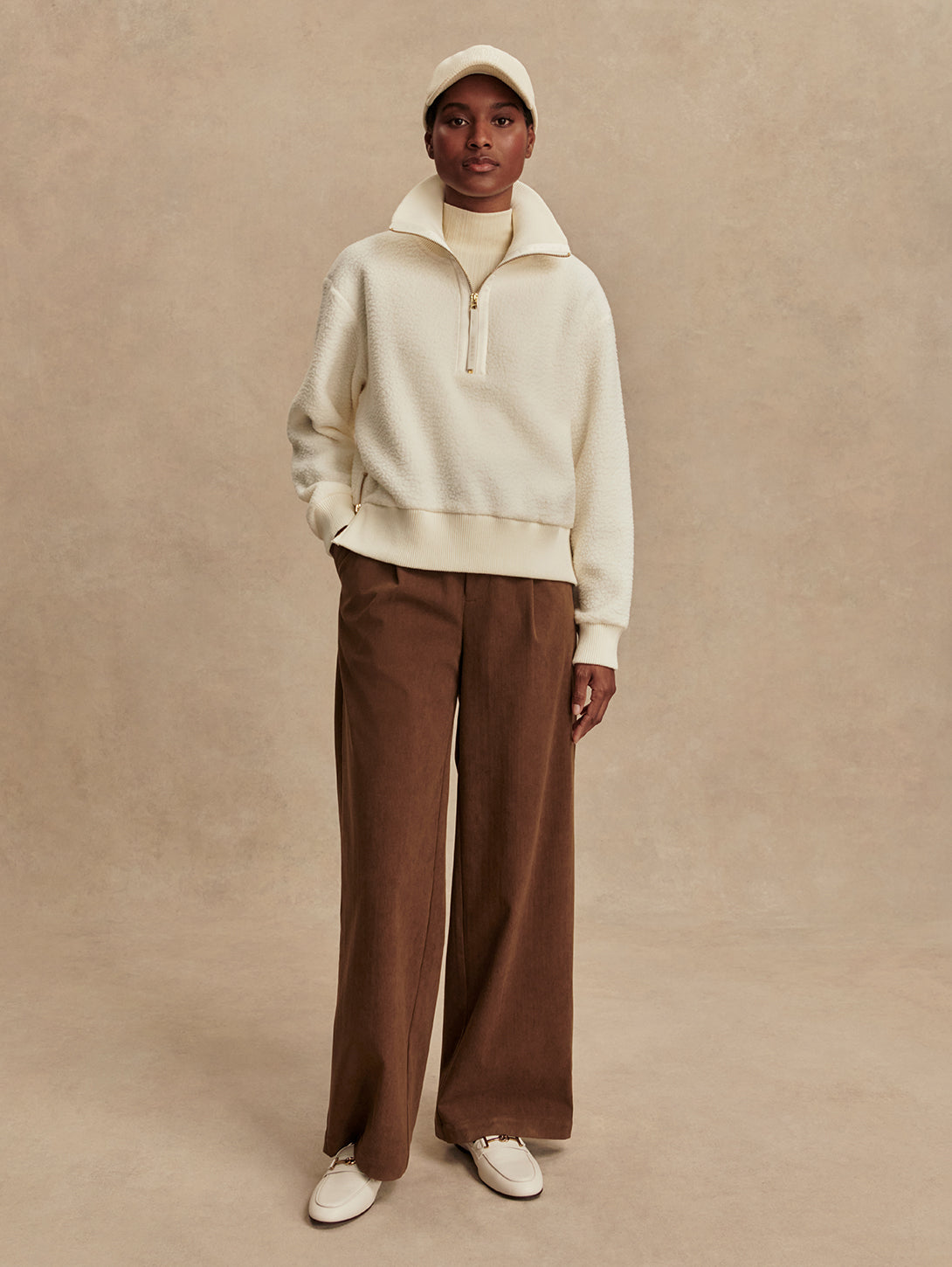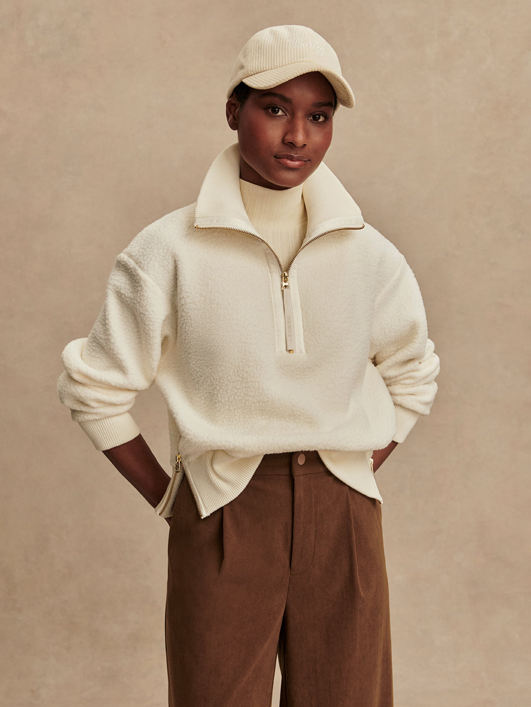 Spotlighting our 100% Recycled Plush Borg Fleece, this style is cut with a half-zip collar, ribbed cuffs and loose fit sleeves. Trademark side zip detailing and a luxe sateen trim elevate the design.