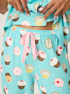 Sweeten your holiday season in this cotton flannel pajama set, scattered with cupcakes in aqua bows. The three-piece design includes a button-down top with contrast piping, relaxed drawstring pants, and a matching headband—made for the cozy mornings that stretch into afternoons.
