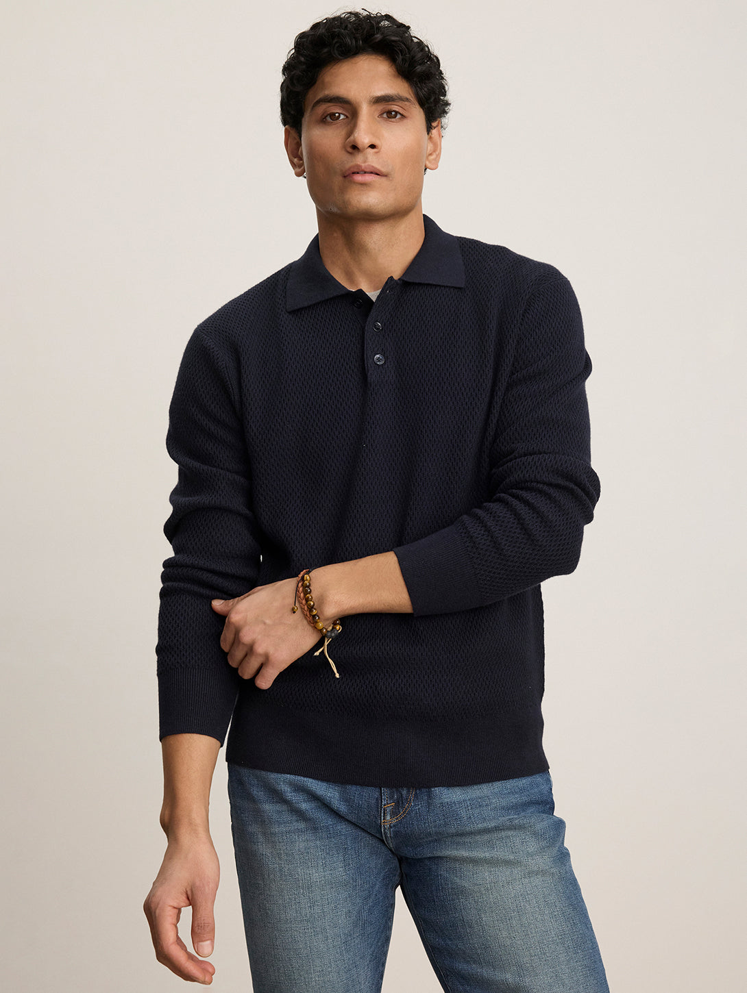 Refined comfort meets casual sophistication in this cotton cashmere long sleeve polo. Knit from a lightweight blend of breathable cotton and ultra-soft cashmere, it offers a smooth, elevated feel with a relaxed fit.