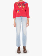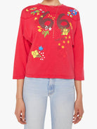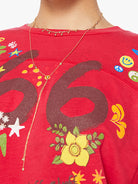 Inspired by a football jersey, this oversized crewneck tee is designed with drop shoulders, 3/4 sleeves and a boxy fit. Made from 100% cotton in red, the shirt features a faded 66, MOTHER's name across the shoulders and colorful mushrooms, butterflies and flowers throughout.