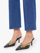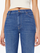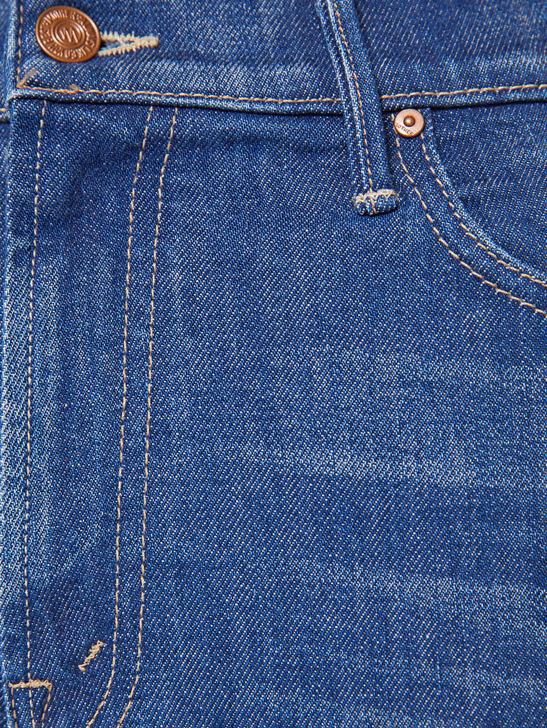 Off the grid. A high-rise straight leg jean with a zip fly, 28.25-inch inseam and a clean hem. Made from denim with a touch of stretch, Do Not Disturb is a mid-blue with whiskering and fading at the knee.