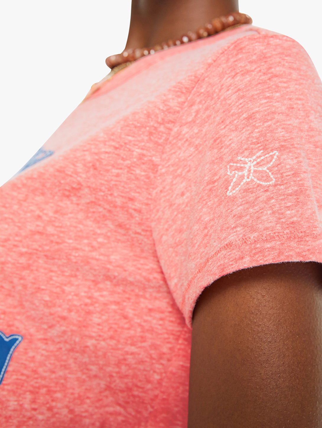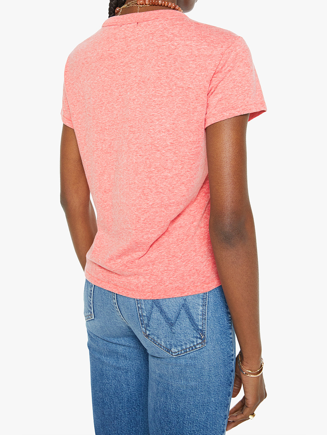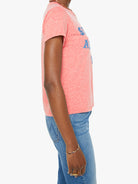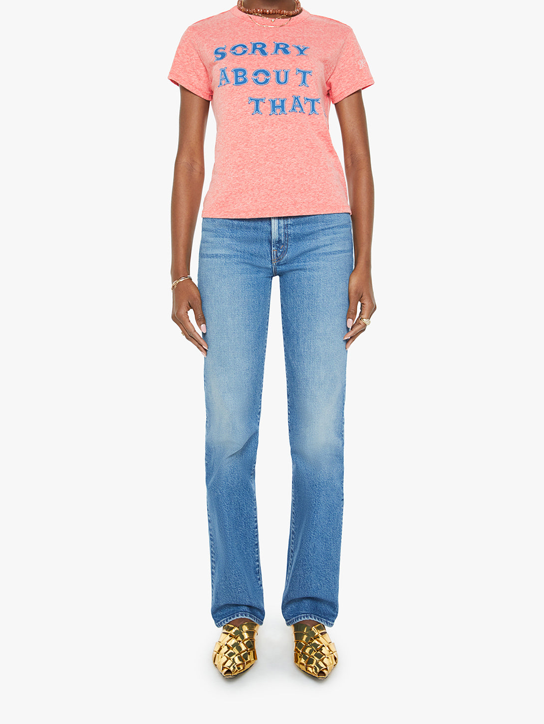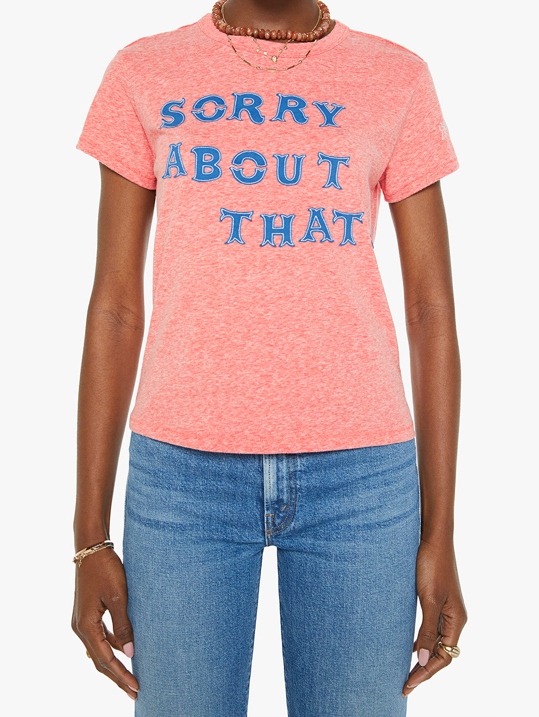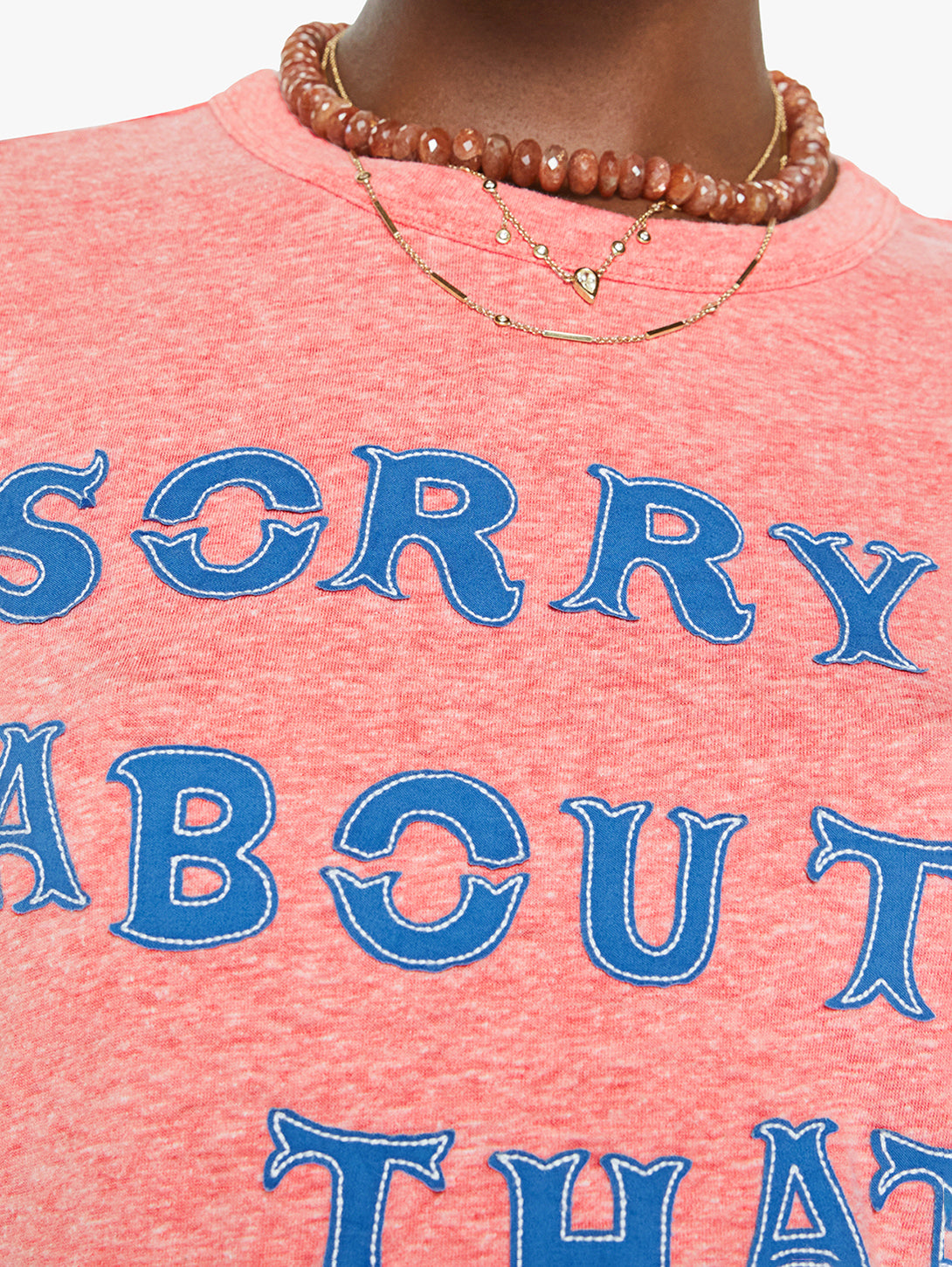 My bad. The Lil Goodie Goodie in Sorry About That is a soft, slightly sheer crewneck with a slim fit for a vintage look and feel. Made from a cotton blend, the faded heathered red tee features block text patches in blue on the front with white stitched details.