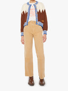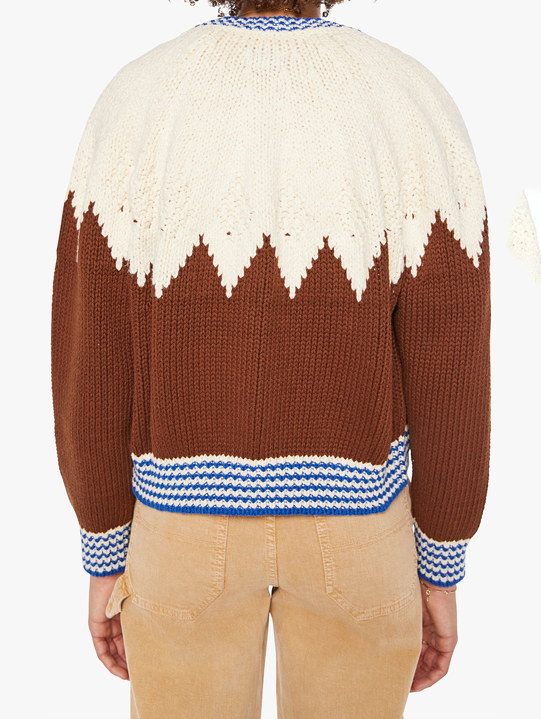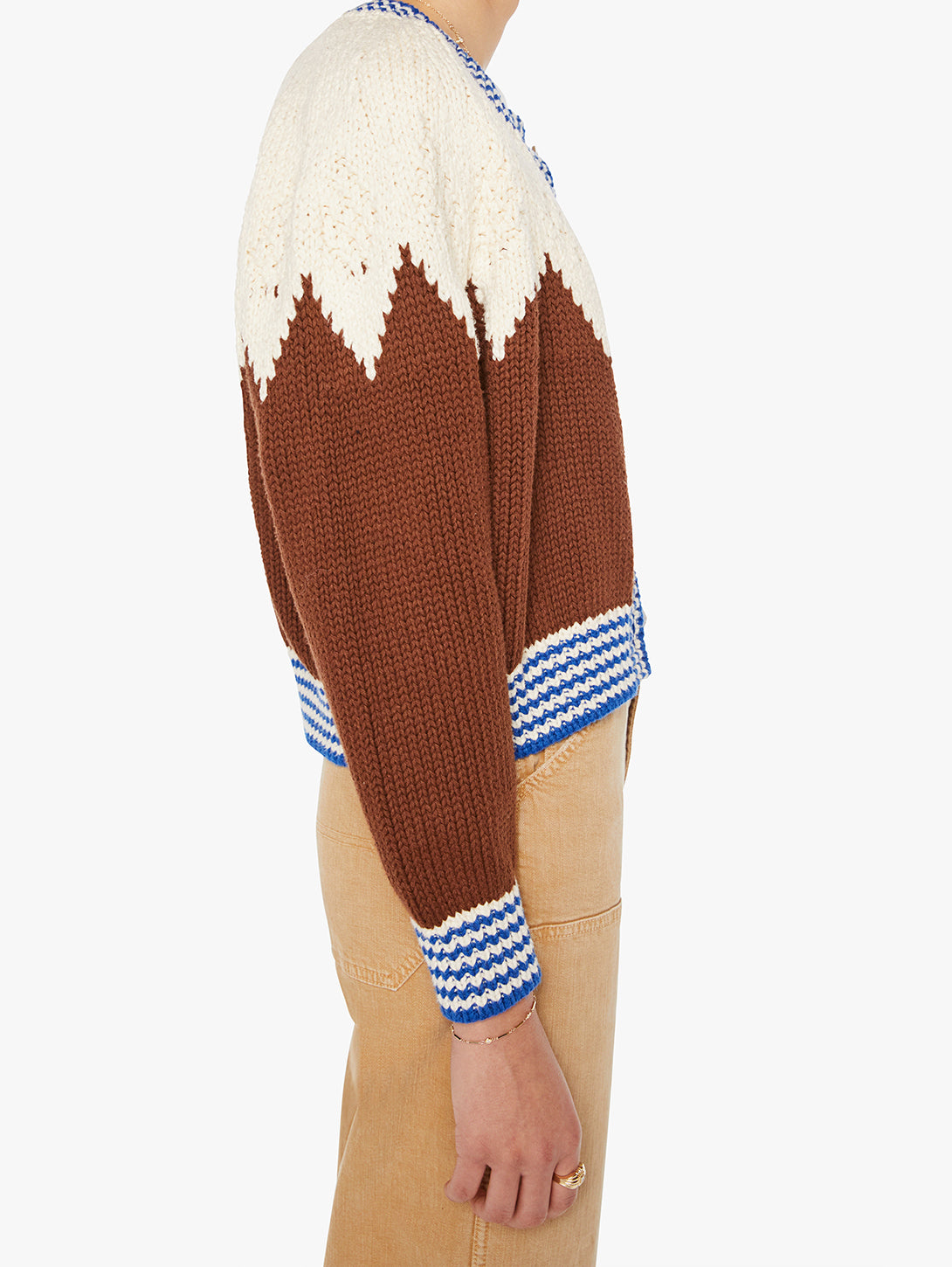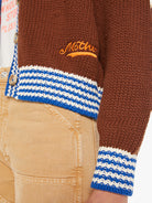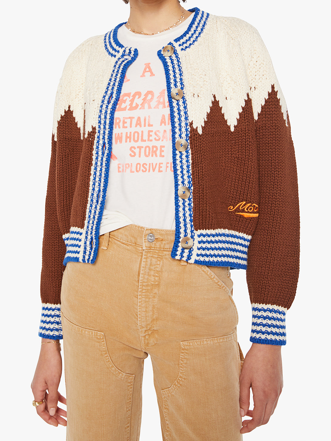 A raglan cardigan sweater with a crewneck. Made from super soft cotton, the cardigan is knit in brown, cream with blue stripe hems.