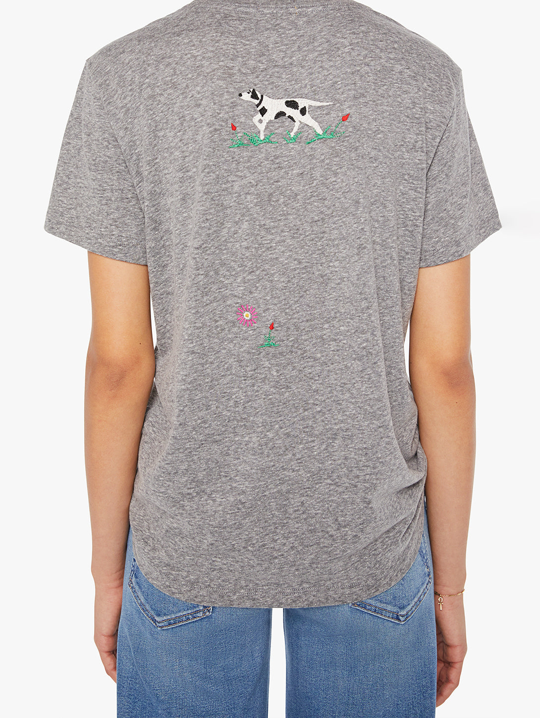 Run don't walk. A crewneck tee with an oversized fit and a clean hem. Made from a cotton blend, the heathered grey tee features yellow block text on the front and colorful embroidery throughout.