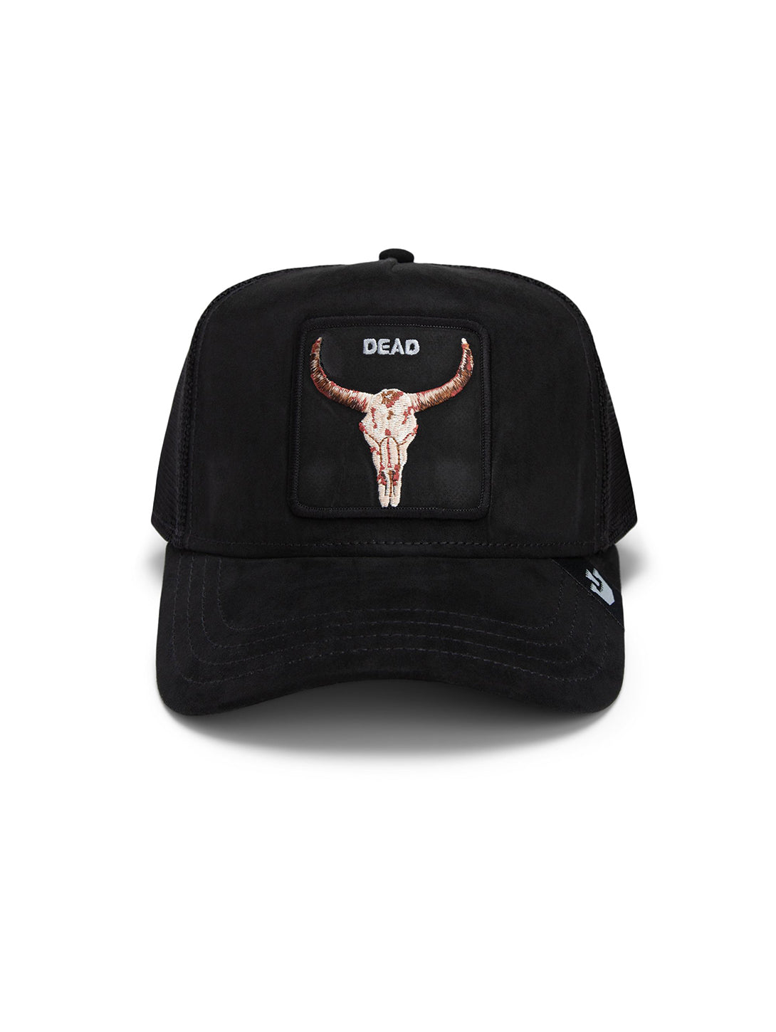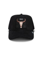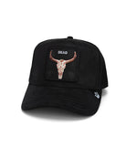 If this hat could talk, it wouldn’t. It would just stare into your soul, nod once, and ride off into the desert. Longhorn skull, camo backdrop, one word: "Dead." Sometimes, less is more.