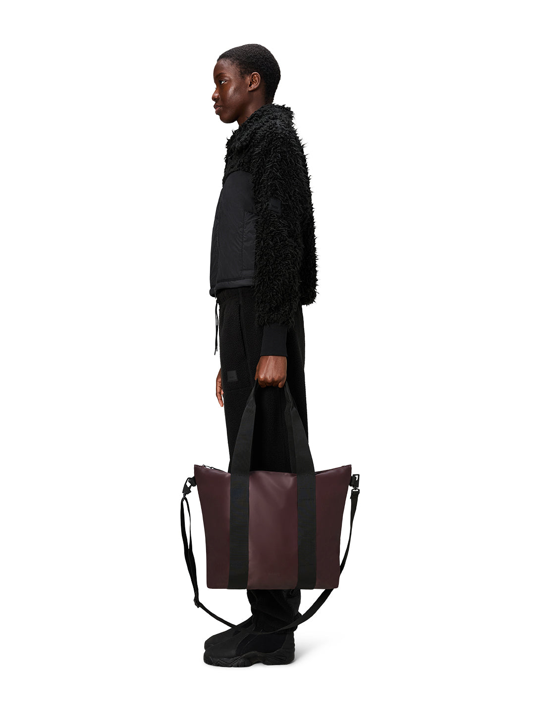 The full-length coated zip reveals a spacious main compartment for everyday essentials. Designed to meet your carry-needs, Tote Bag Mini offers various carrying options through its detachable shoulder strap and long hand/shoulder handles. Carry handles feature attachment rings for small items like keys. Tote Bag Mini is cut from Rains' signature PU fabric, engineered for carrying strength, durability and a smooth feel.