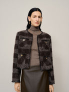 This tailored cropped jacket showcases textured tweed in a deep maroon shade. It provides structured form and visual depth, ideal for enhancing denim or layered ensembles with sophistication.