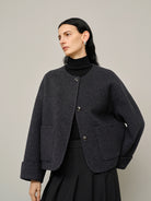 This tailored short wool jacket in a bold extreme gray shade offers warmth and a fashion-forward silhouette. Features sharp lapels and premium construction.