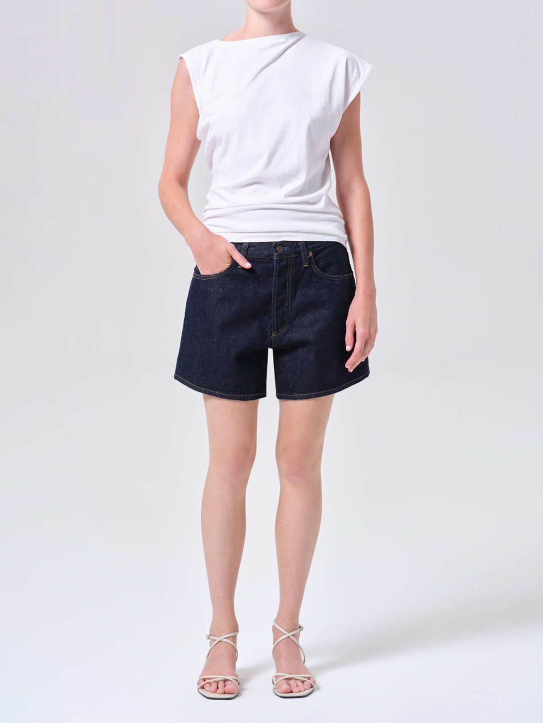 The Leith Vintage Short is designed with an oversized fit and a dropped rise, offering a relaxed yet considered silhouette inspired by classic vintage denim. Rendered in a clean dark rinsed indigo wash, it delivers a crisp, elevated take on an easy warm-weather essential. Finished with a clean hem, this pair brings a polished edge to its laid-back shape. Crafted from non stretch, weightless 100% regenerative cotton denim washed down for a super soft feel, it drapes effortlessly while maintaining its structure.