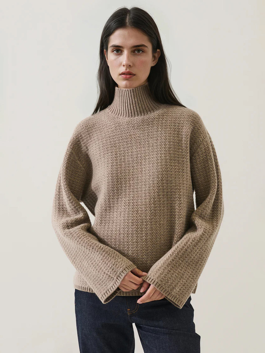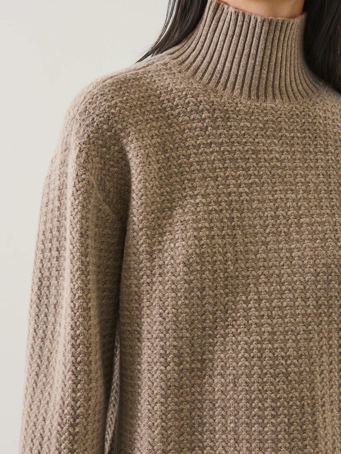 Our waffle stitch mock neck embodies elegance and is crafted from a soft merino cashmere. This specialty piece is designed for an oversized fit, features a drop shoulder and a sophisticated waffle stitch throughout. Style over one of our pima cotton t-shirts for ultimate comfort.