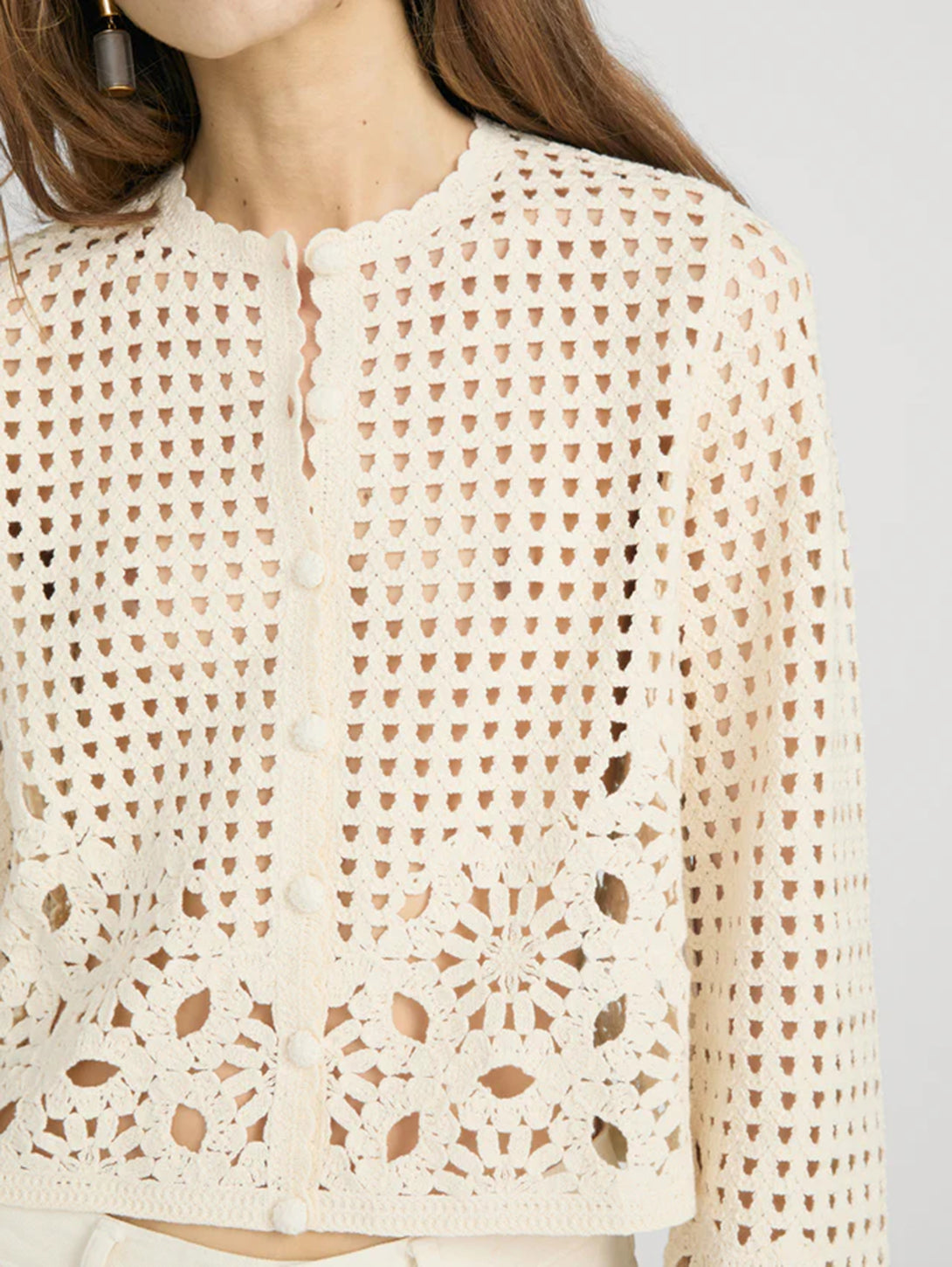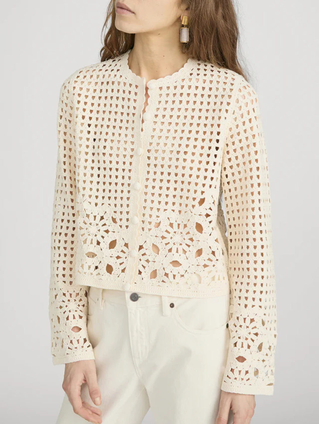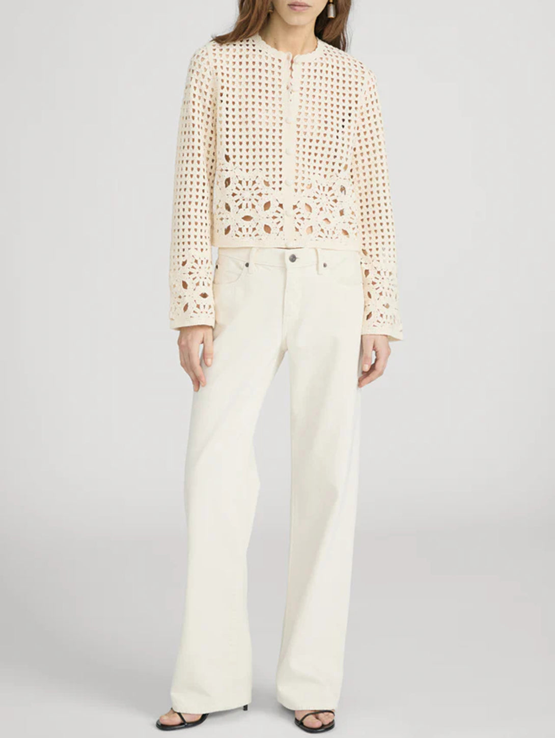 The Postcard Cardi is a lightweight layer with a relaxed, slightly cropped silhouette. Designed with detailed crochet throughout, it features a button-front and soft texture for an easy, elevated finish. Crafted from 100% cotton, it’s a versatile piece for layering across seasons.