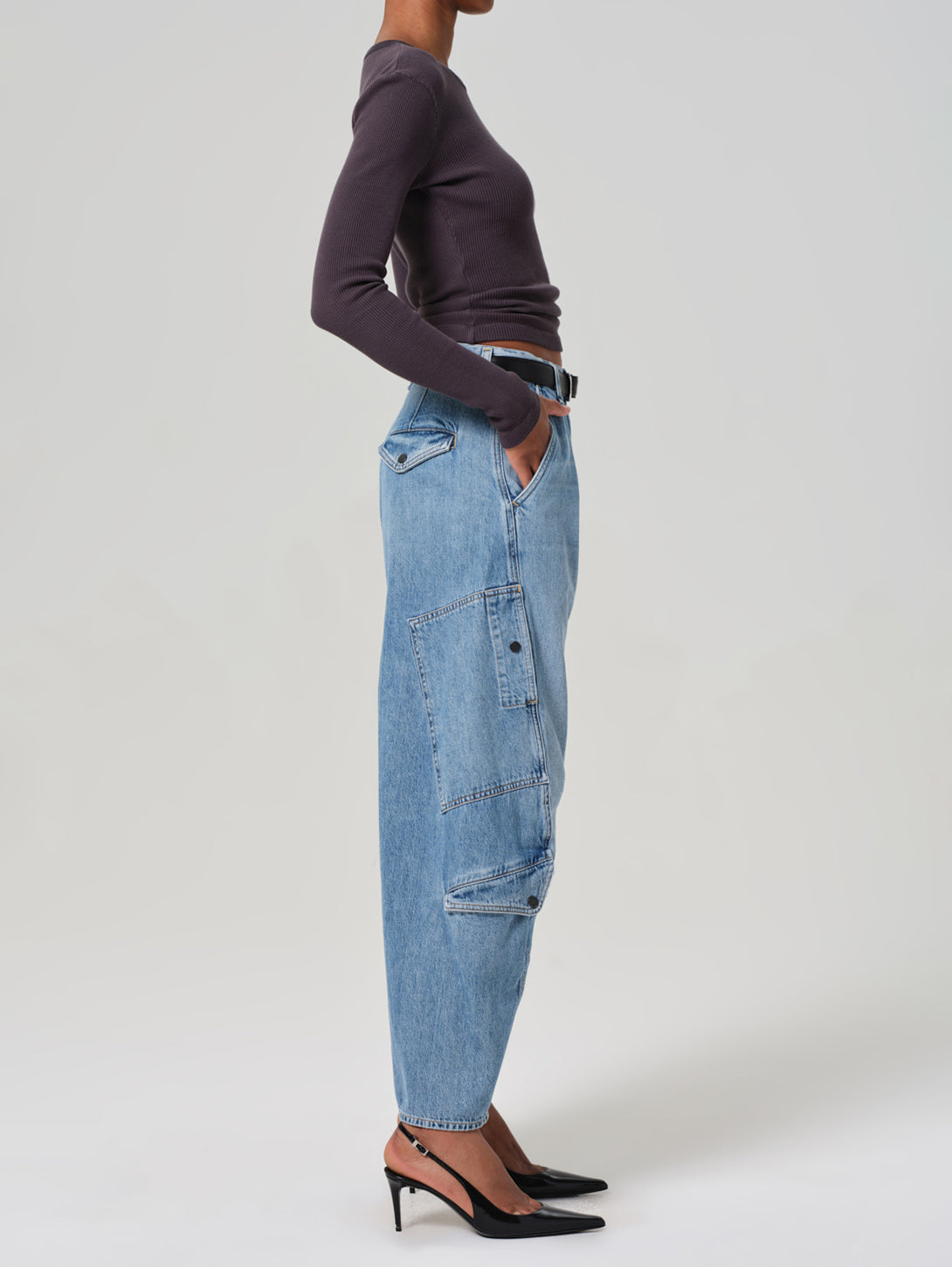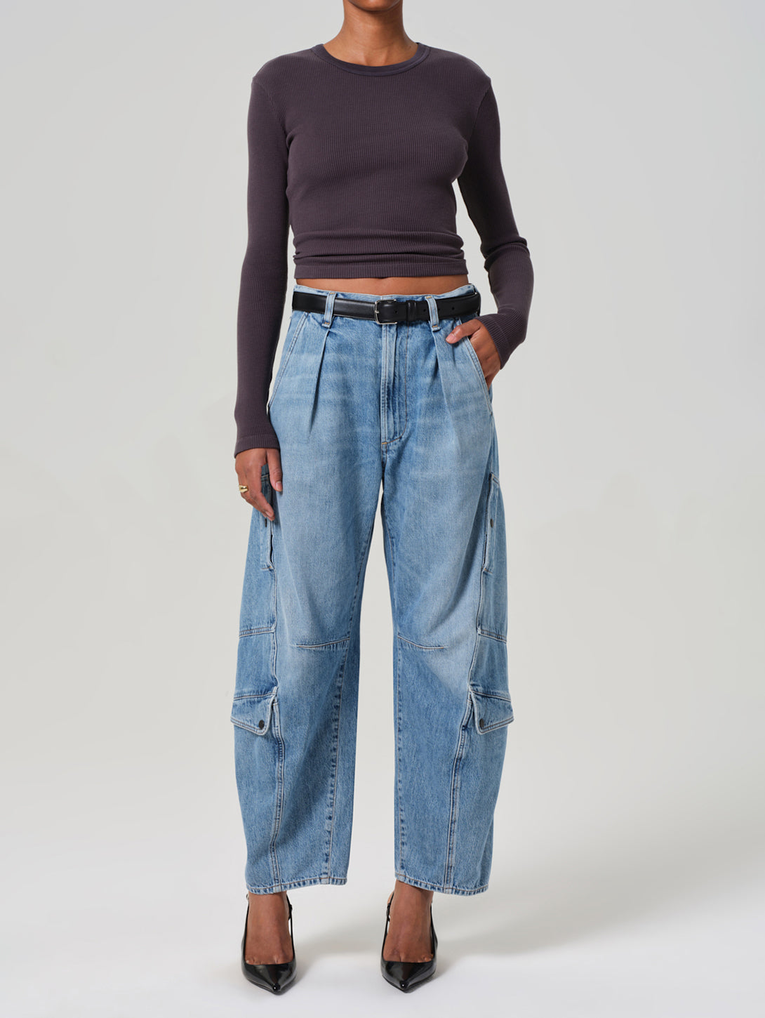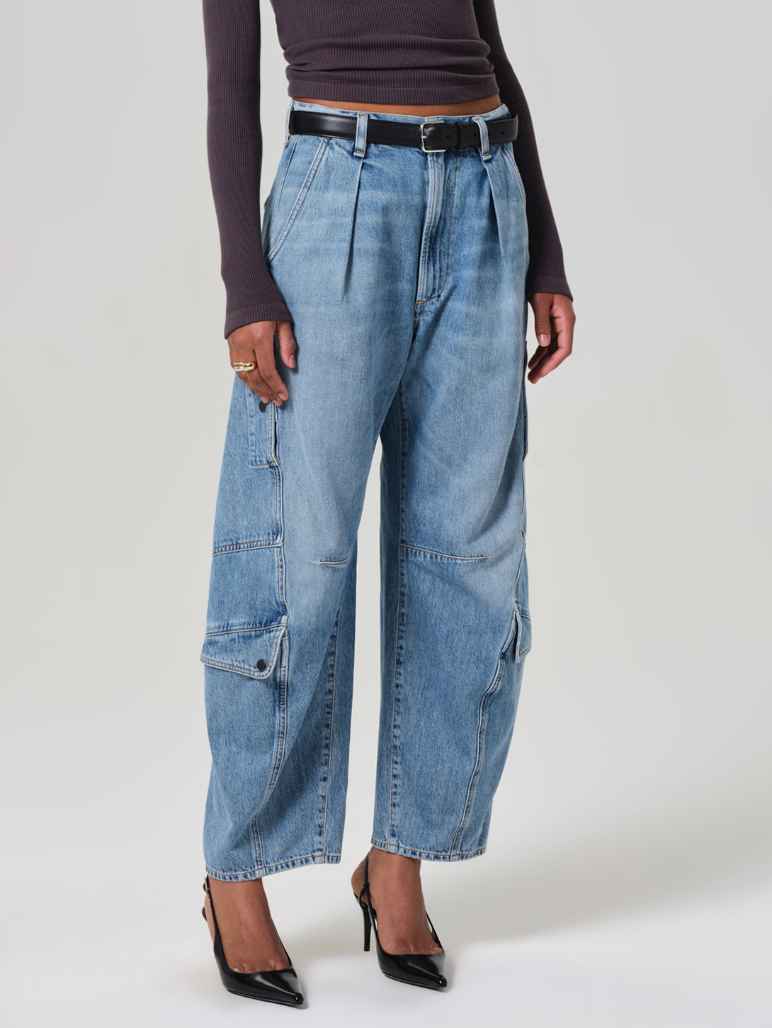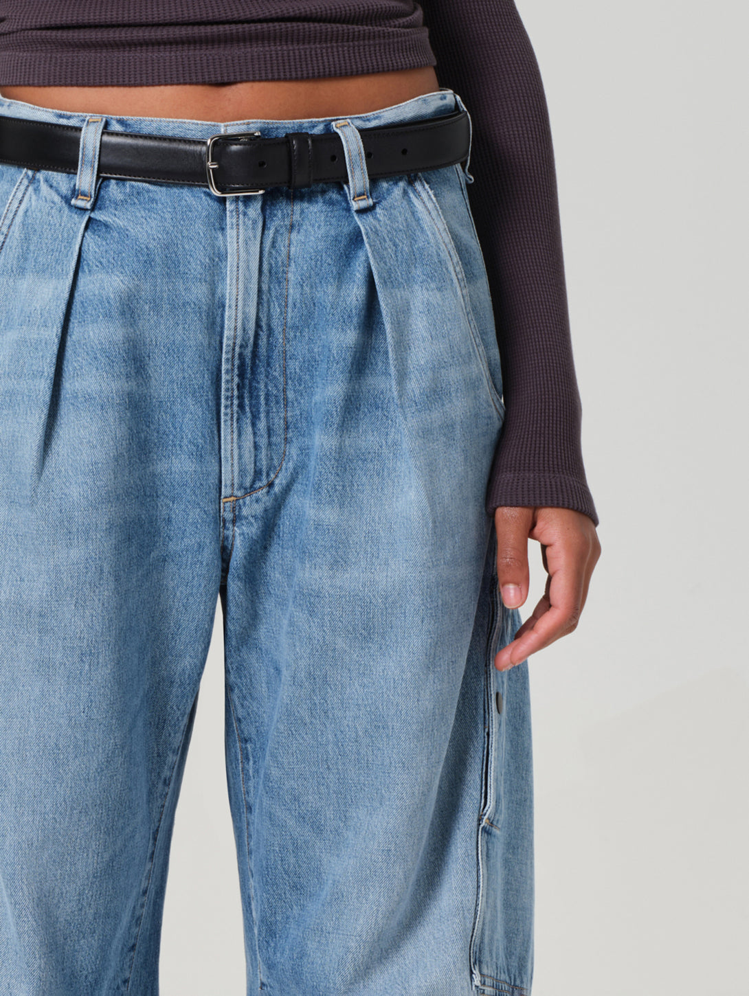 Vintage-inspired utility fit with a pleated waist and barrel leg silhouette.
