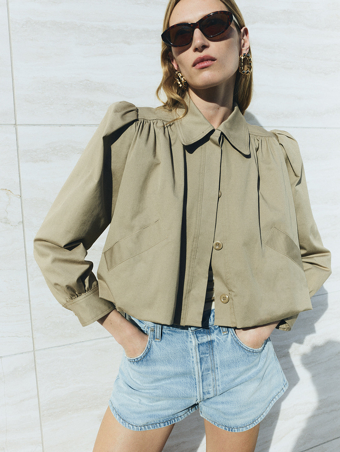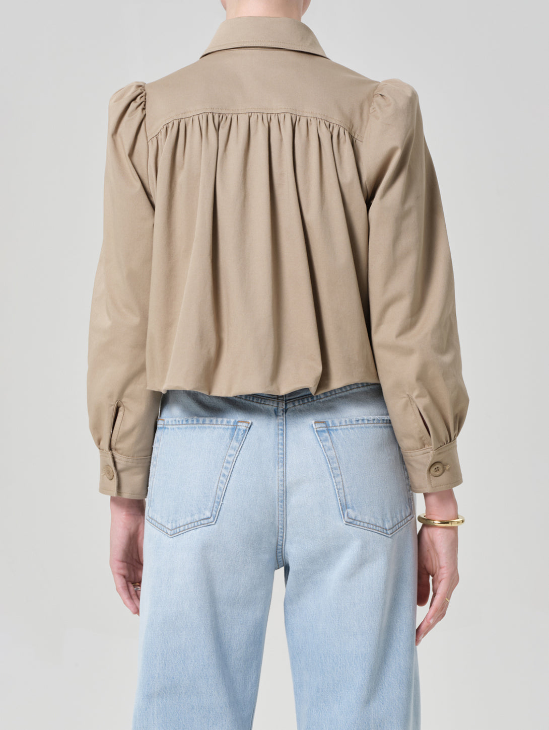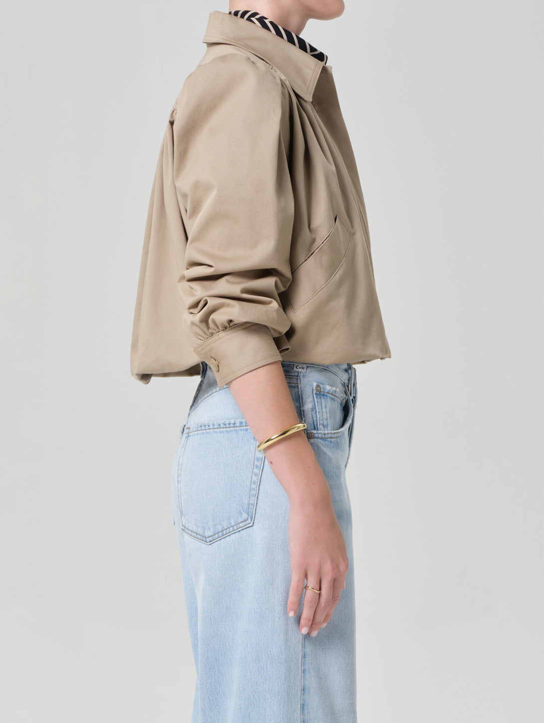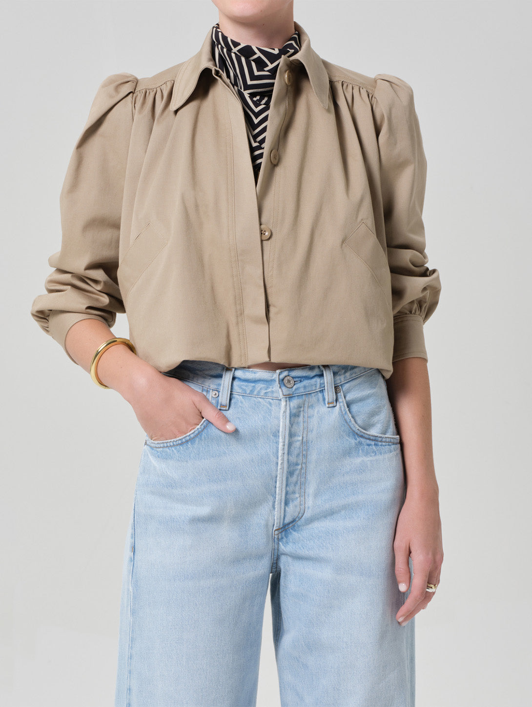 The Everly is a cropped, shirred jacket cut from midweight stretch twill made with regenerative cotton. Designed with a soft hand and vintage feel, it features subtle puff sleeves, pleated detailing, and a light-to-medium beige tone that adds warmth and polish. Effortlessly breathable and tailored for ease—an elevated layer that moves with you season after season.