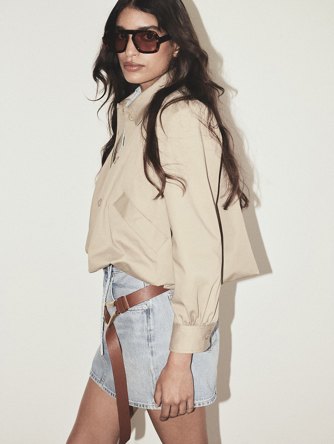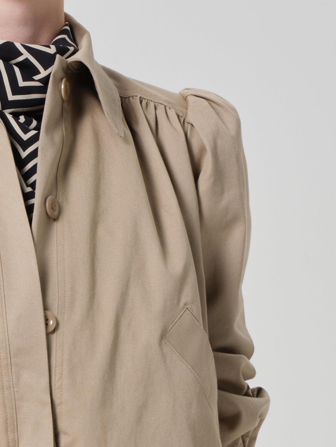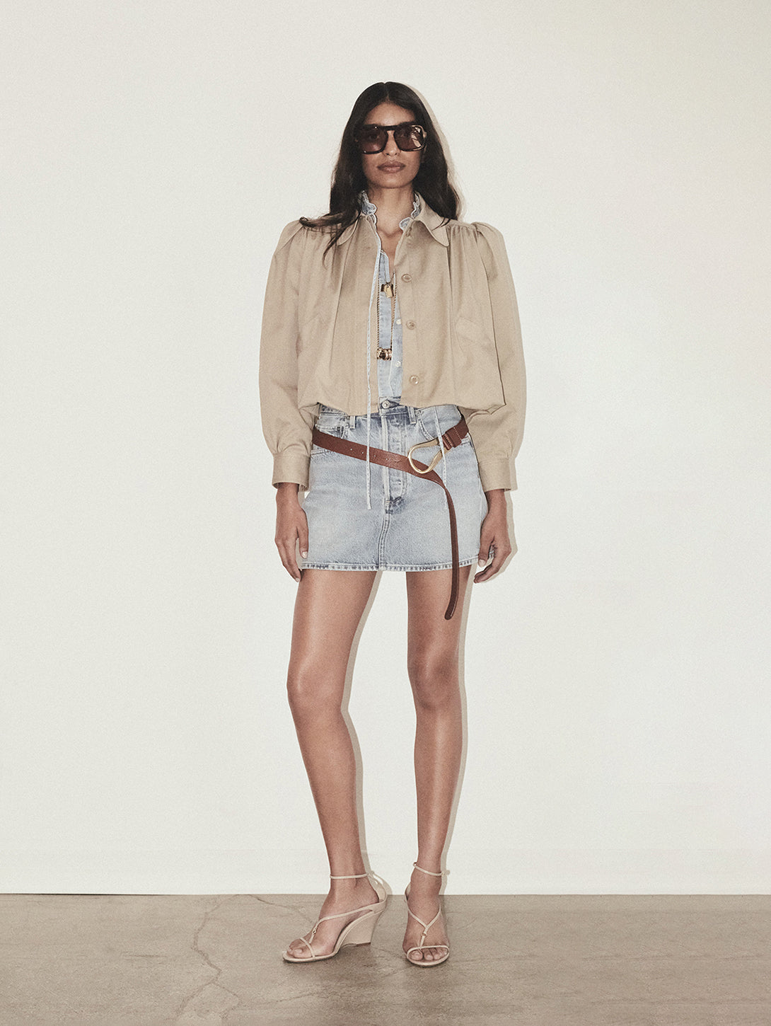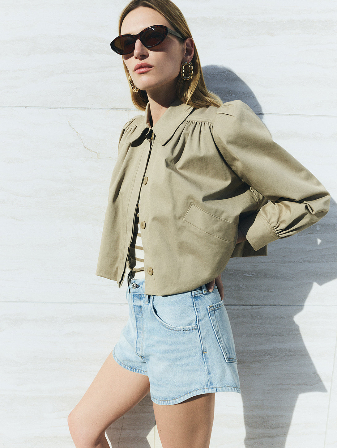 The Everly is a cropped, shirred jacket cut from midweight stretch twill made with regenerative cotton. Designed with a soft hand and vintage feel, it features subtle puff sleeves, pleated detailing, and a light-to-medium beige tone that adds warmth and polish. Effortlessly breathable and tailored for ease—an elevated layer that moves with you season after season.