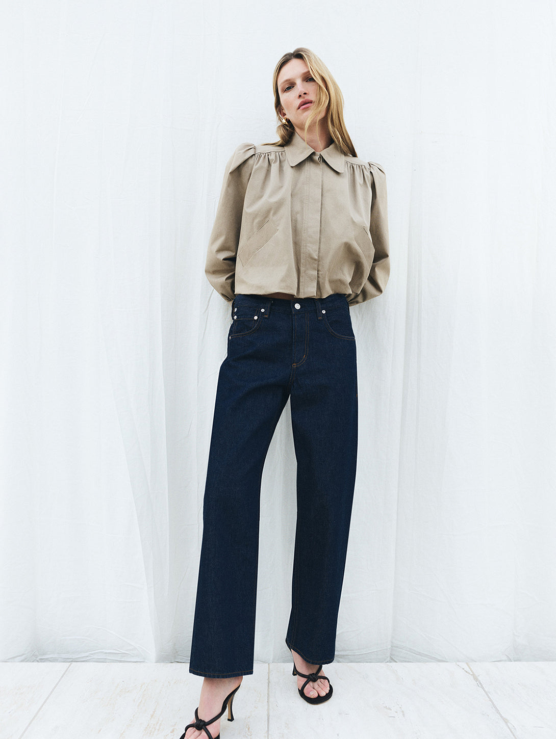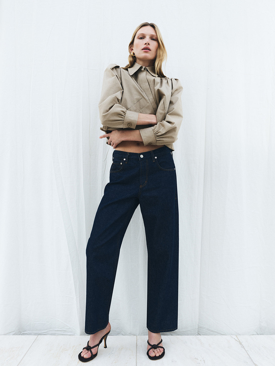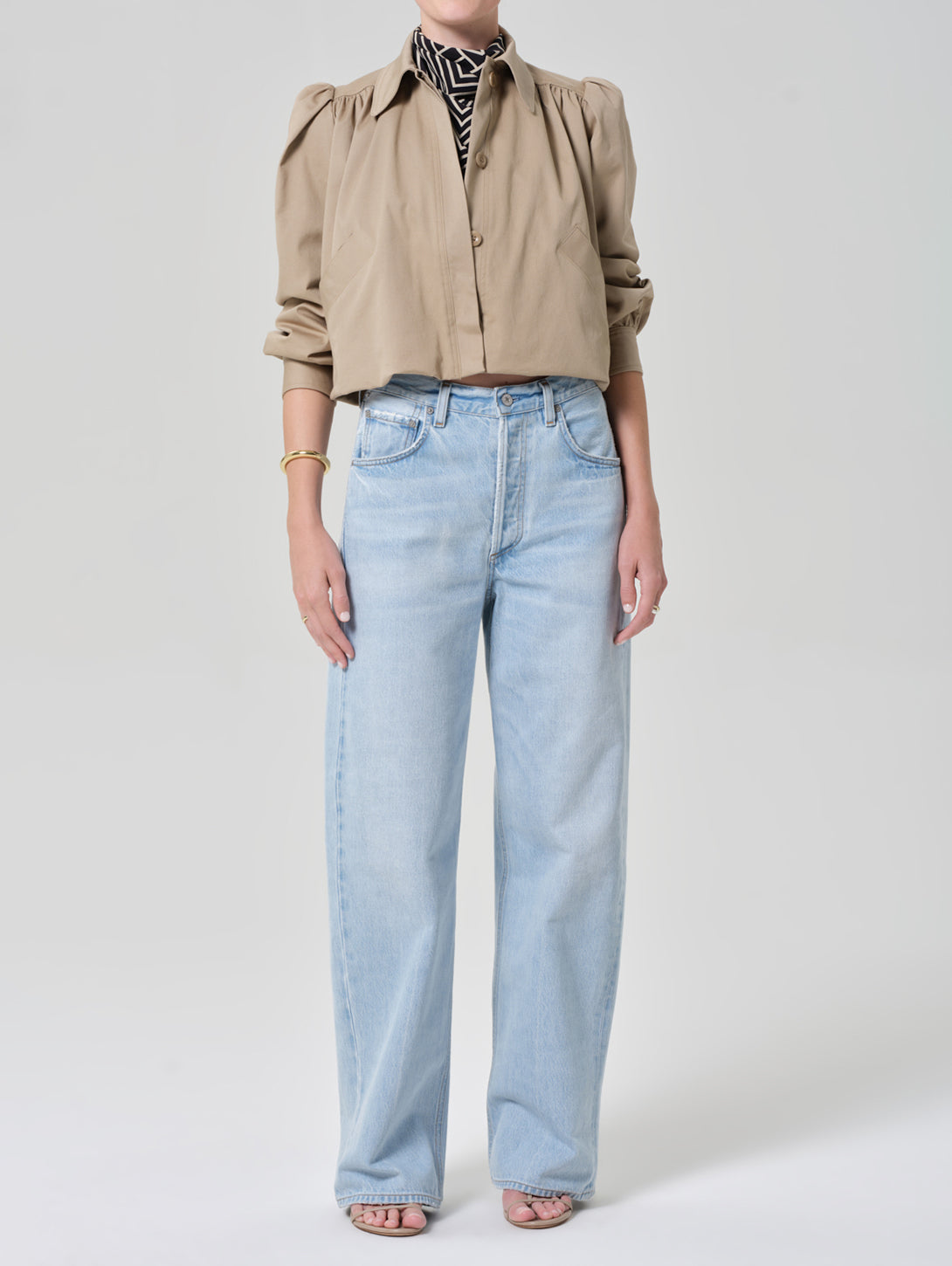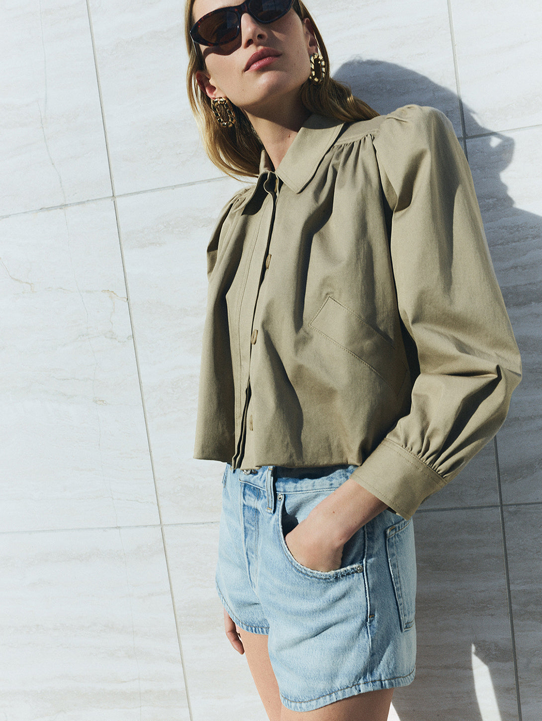 The Everly is a cropped, shirred jacket cut from midweight stretch twill made with regenerative cotton. Designed with a soft hand and vintage feel, it features subtle puff sleeves, pleated detailing, and a light-to-medium beige tone that adds warmth and polish. Effortlessly breathable and tailored for ease—an elevated layer that moves with you season after season.