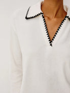 The Cati sweatshirt is made from breathable terry and features a wide collar, V-neckline, loose fit, long sleeves, and contrast blanket embroidery.
