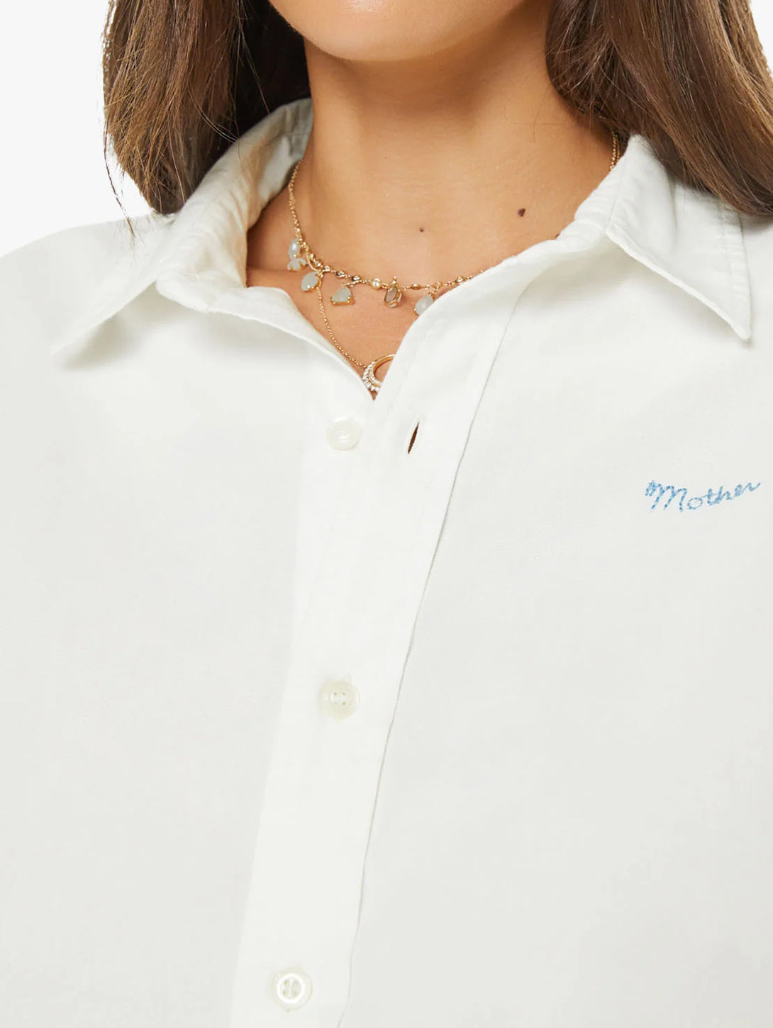 An expanded collection of foundational pieces designed for All Day, Every Day. Created for versatility, layering, and year-round wearability, these are the pieces you will never stop reaching for. A classic button-up with a curved hem and MOTHER's name embroidered on the chest. Made from 100% cotton, The Bestie is designed in a warm white.