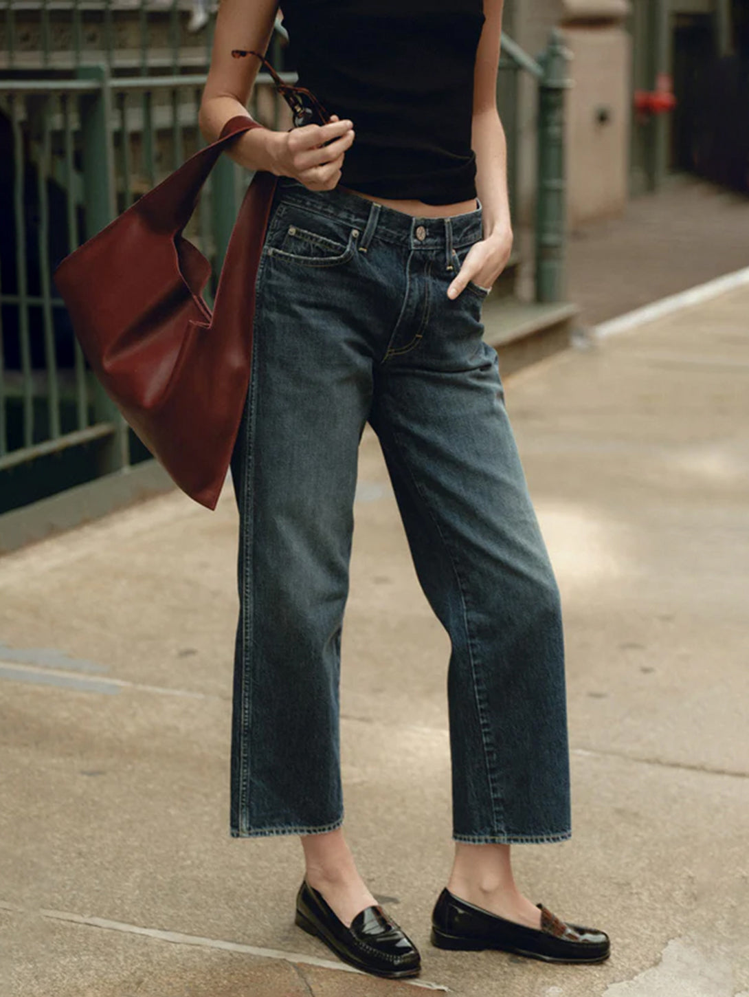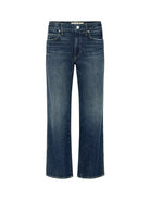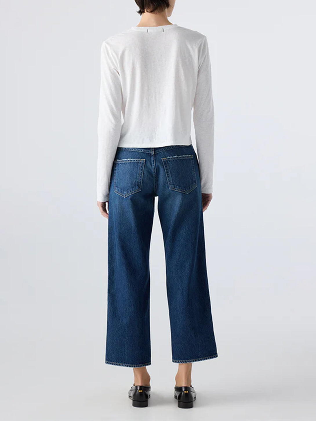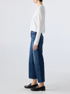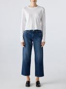 This cropped, wide straight leg is our easiest fit yet. Cut from premium rigid denim with a mid rise, this pair is meant to sit low on the hips for a relaxed look. Thoughtful distressing throughout. Denim hem. Zip fly.