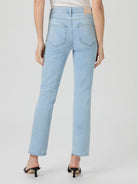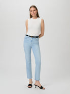 This mid rise, perfectly straight jean is lean through the leg and finishes at the ankle with a raw hem. This pair is cut from PAIGE Vintage denim in a perfectly lived-in light wash with whiskers and shiny hardware. PAIGE Vintage takes all of the work out of breaking in your favorite pair of vintage jeans. We've combined the comfort of stretch with everything you love about authentic vintage denim to create super soft jeans that feel perfectly lived-in from the very first wear.