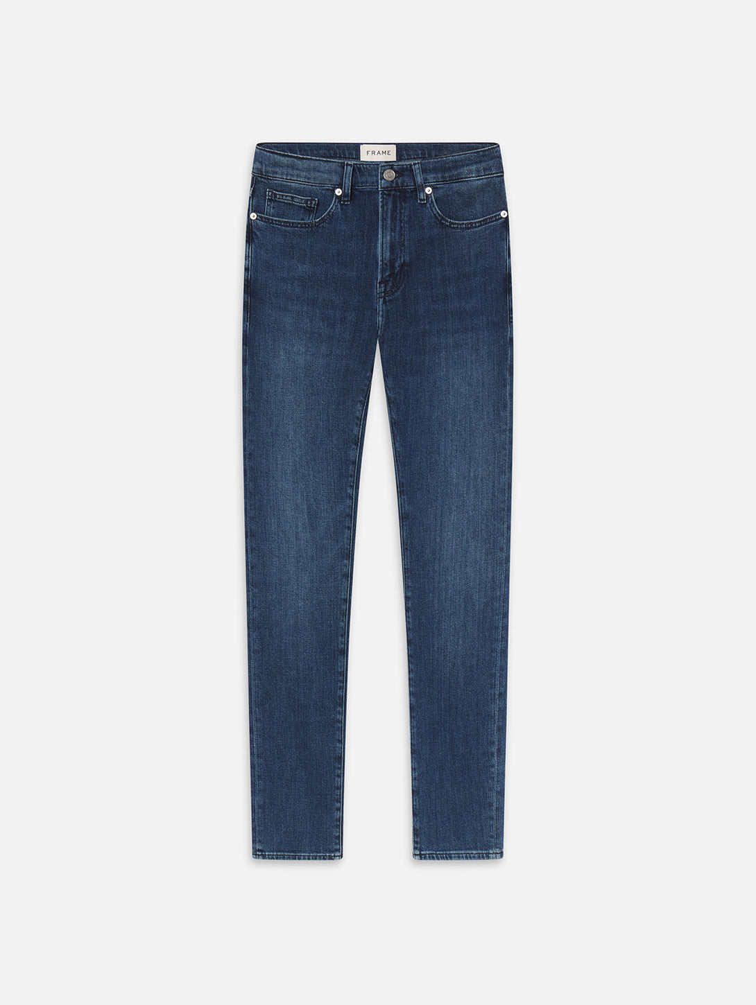 A FRAME signature jean, this style is designed with a classic 5-pocket construction, comfortable mid rise, flattering straight leg, and tapered slim fit at the leg opening. Crafted from smooth, comfort-stretch denim.