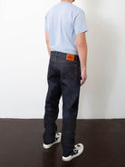 The Edwin Dry Taper is made in Japan from 100% cotton 13.5 oz dark pure indigo rainbow selvage exclusive to the Edwin brand. It has a regular taper style leg opening and 4-button rise closure with a signature copper button waistband. Classic spice contrast stitching and 5-pocket styling make this your ultimate go-to pair of dry jeans.
