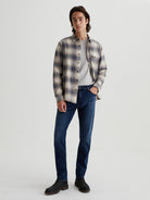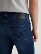 The Tellis modern slim-fit men's jeans feature a fitted upper block and tapered leg openings. Done here in a dark indigo shade with fading and whiskering, this five-pocket pair is crafted from AG's Airluxe™ Aerial Nylon Denim that's light weight and blended with comfort stretch.