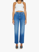 Cut it out. High-waisted jeans with a wide straight leg, zip fly and clean 28.25-inch inseam. Crafted from soft stretch denim, Nip It In The Bud is a mid-blue with subtle fading and whiskering.