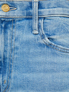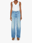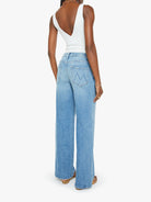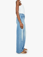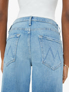 Sunkissed. Slouchy, high-waisted jeans with a loose wide leg and a long 32-inch inseam with a clean hem. Cut from stretch denim, Glow Up is a light blue with whiskering and fading.