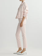 Jodie is classic, oversized denim jacket. It's boxy fit makes it perfect for layering. Ballet is a soft, blush pink denim. It features silver hardware, khaki stitching, a clean hem and an ecru back patch. Original ‘61 is a structured denim weave crafted from certified cotton that adapts to your body’s shape to become uniquely your own.