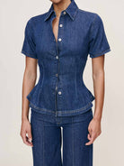 Joice Shirt is a cropped and fitted button down shirt with wider short sleeves.