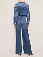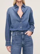 Faye is a relaxed-fit button down shirt with a pointed collar, high-low rounded shirt tail hem and a patch pocket at the chest. Del Ray is bright indigo wash with authentic character. It features silver hardware, khaki stitching and clean finishing.