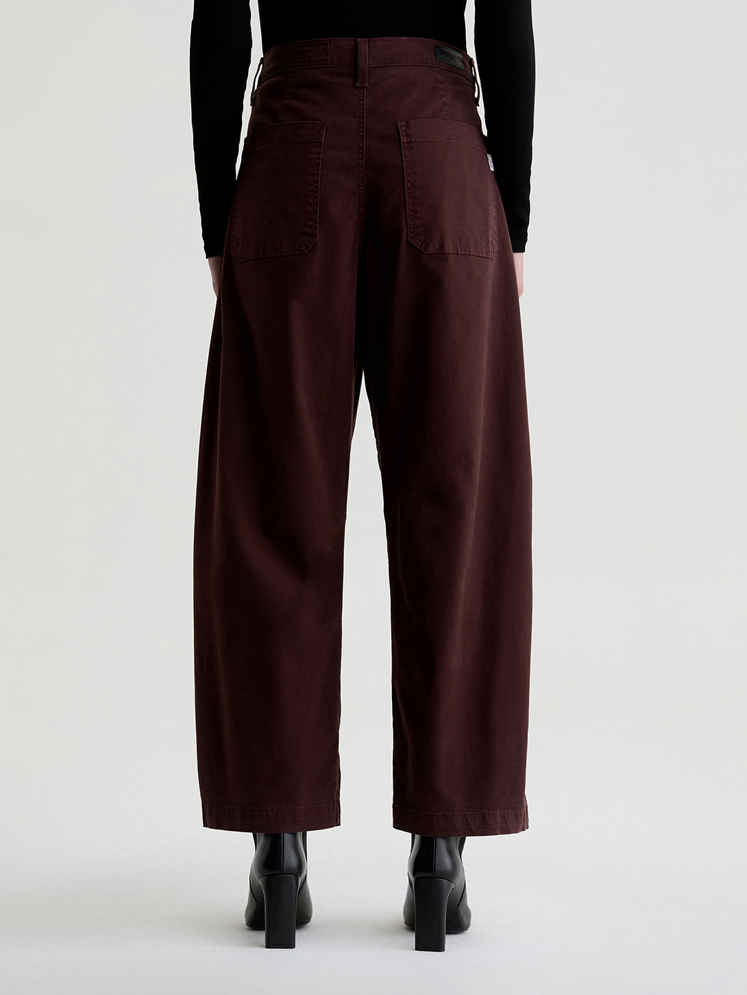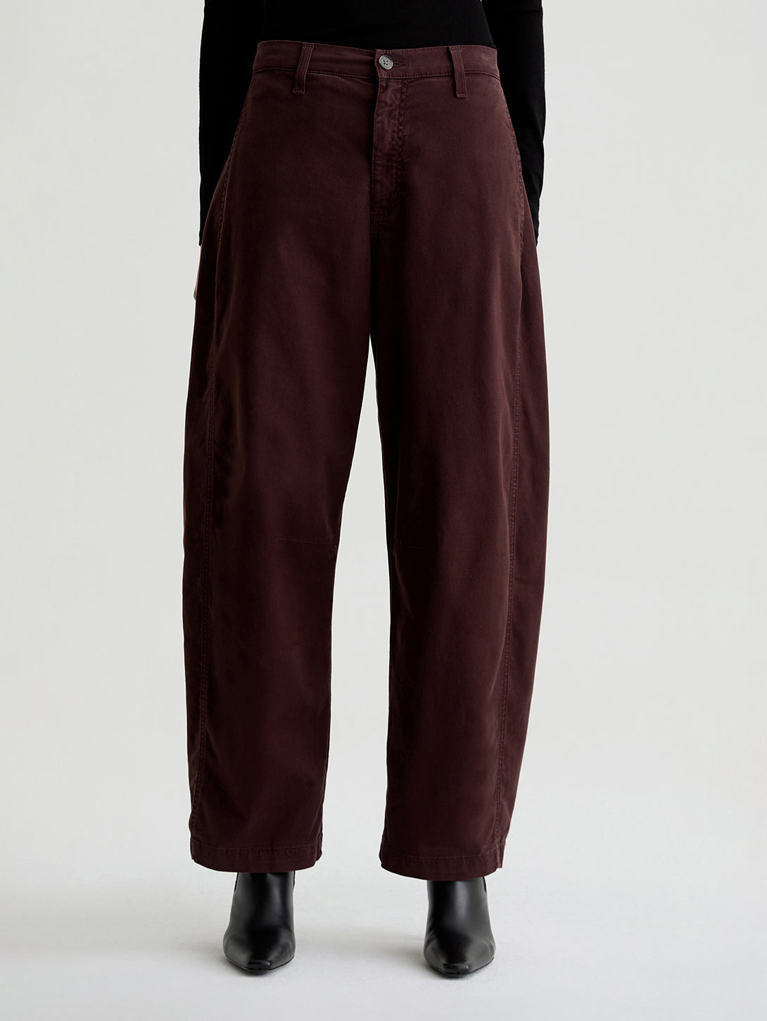 Fiona is a barrel-leg chino with a high waist and slant front pockets. Landing at an ankle-skimming length, it's got slightly curved outer seams and darting at the inner knees.