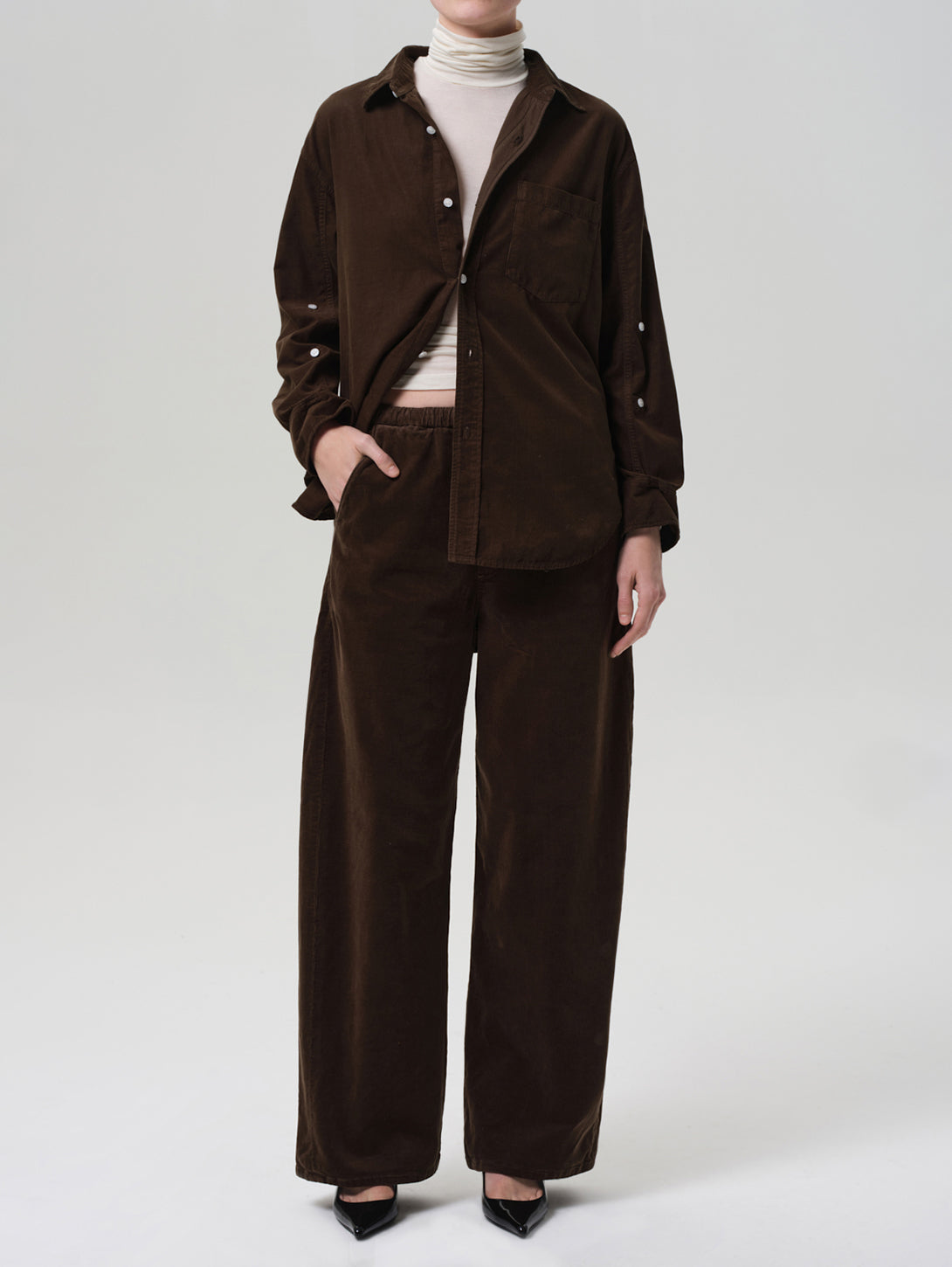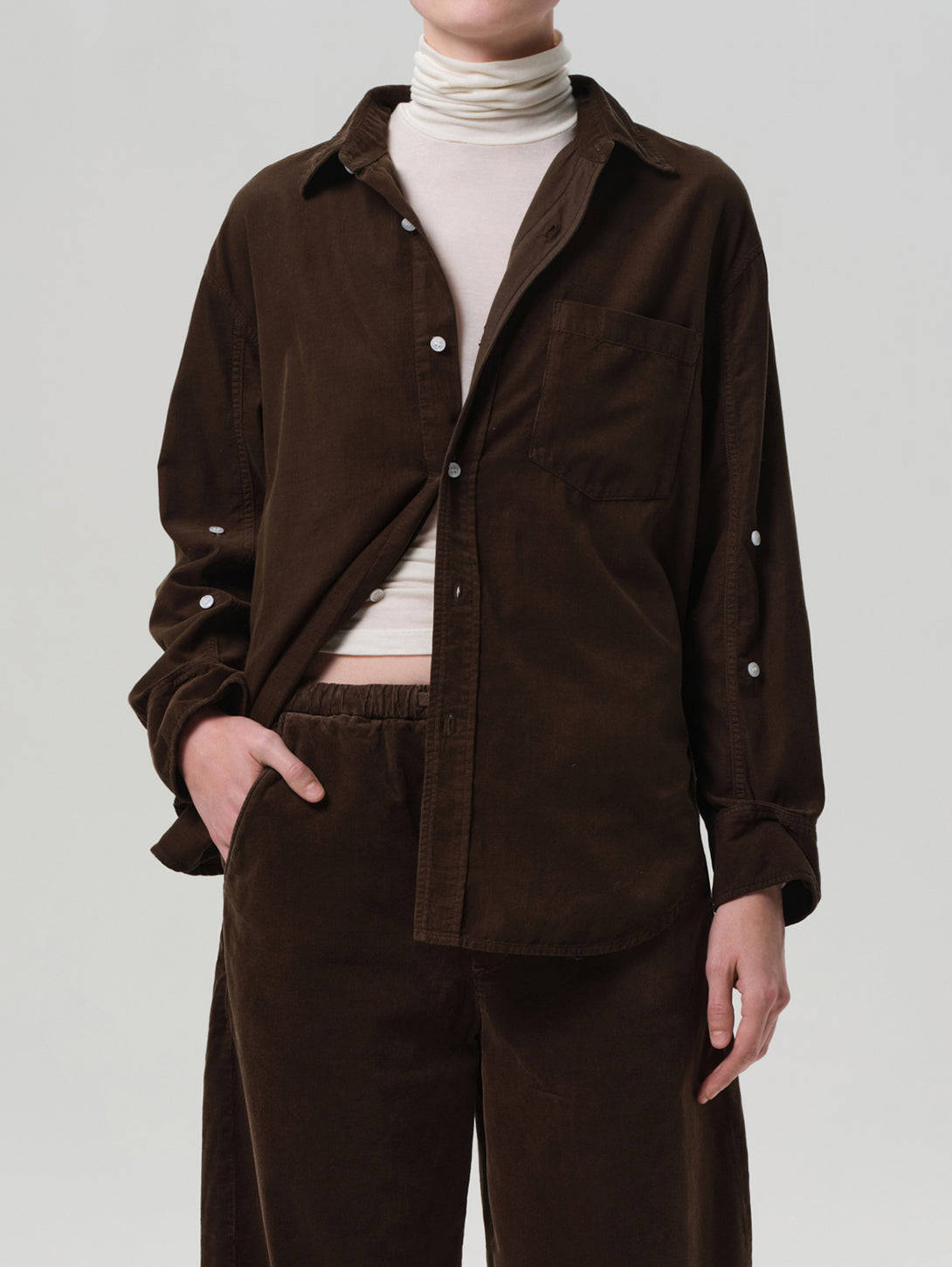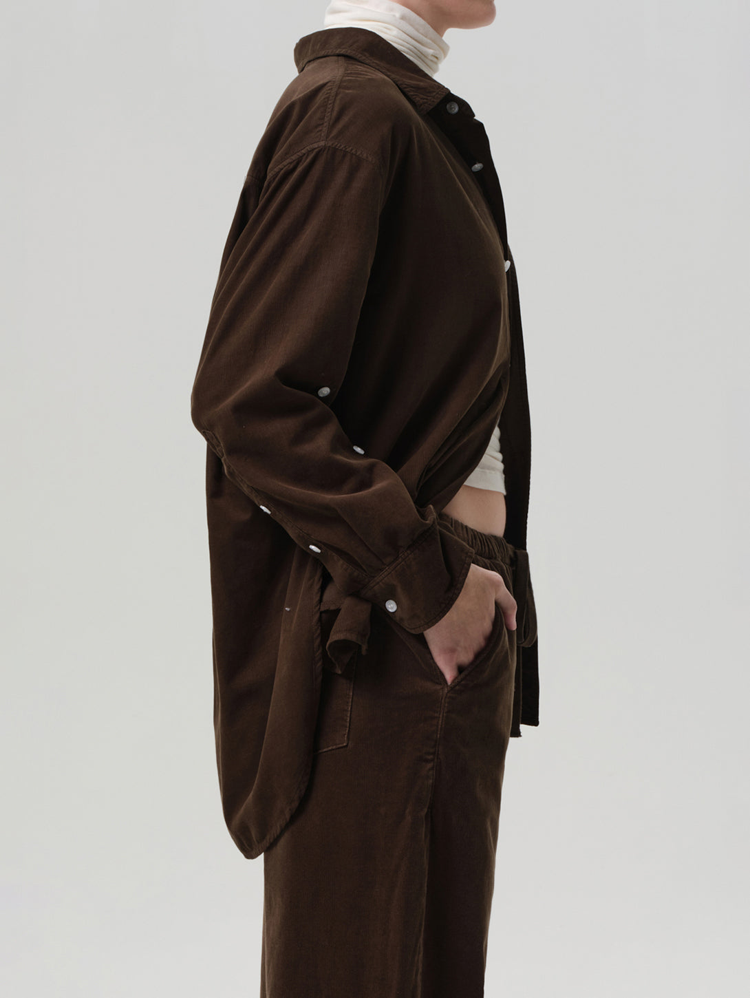 The Kayla Shirt is a timeless button-up reimagined in lightweight baby corduroy with a soft, velvety hand. Designed with a relaxed silhouette and full-length sleeves, it drapes effortlessly for a laid-back yet polished feel. Wear it tucked, layered, or left loose for versatile everyday styling.