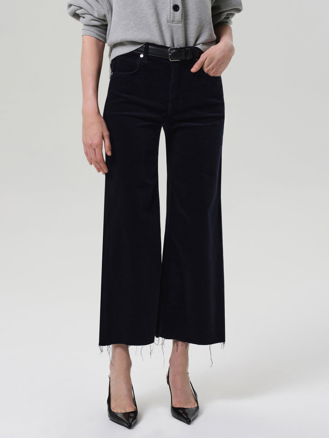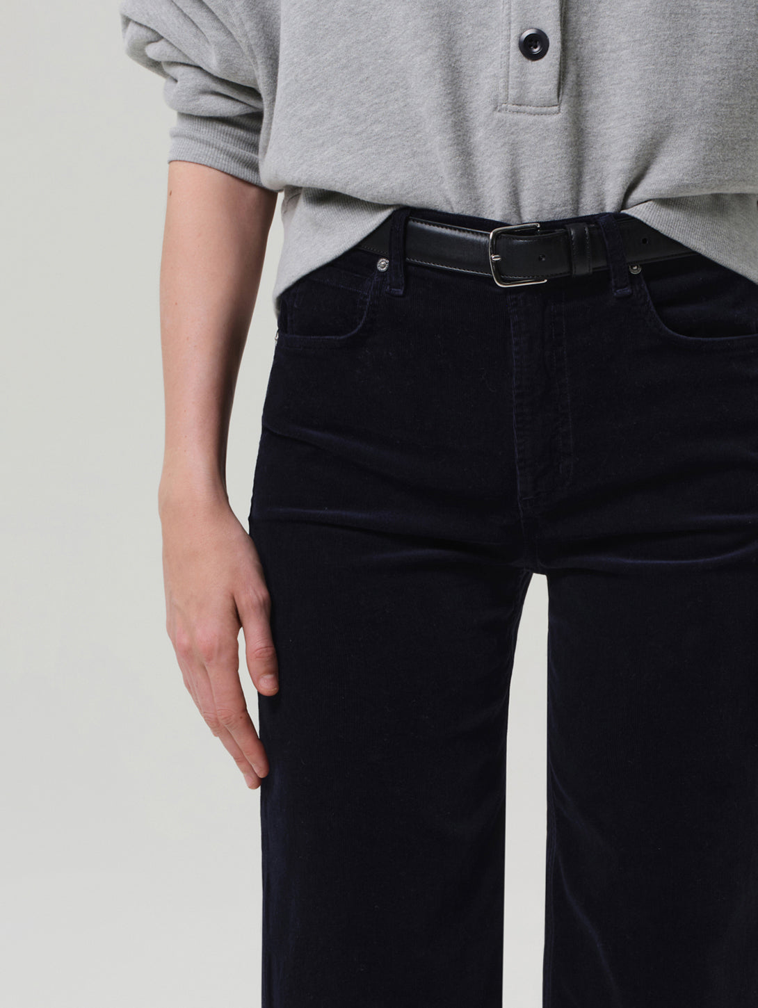 The Lyra is a vintage-inspired wide leg that sits high on the waist with a relaxed top block and cropped inseam for a voluminous, modern shape. Cut in soft stretch baby corduroy, the deep navy hue offers a refined take on texture—ideal with crisp shirting or slouchy knits.