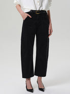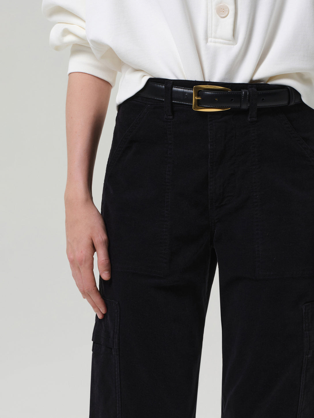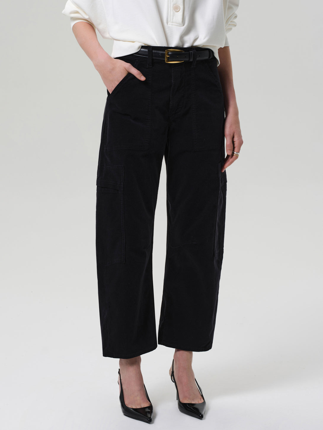 The ‘Marcelle’ is a modern utility staple, cut from soft stretch baby corduroy with a textured hand. Designed with a high rise and tapered leg, it features cargo-style pockets for an effortless balance of structure and ease. Charcoal grey adds a clean, contemporary feel—versatile with boots, sneakers, or slides.
