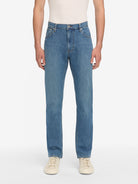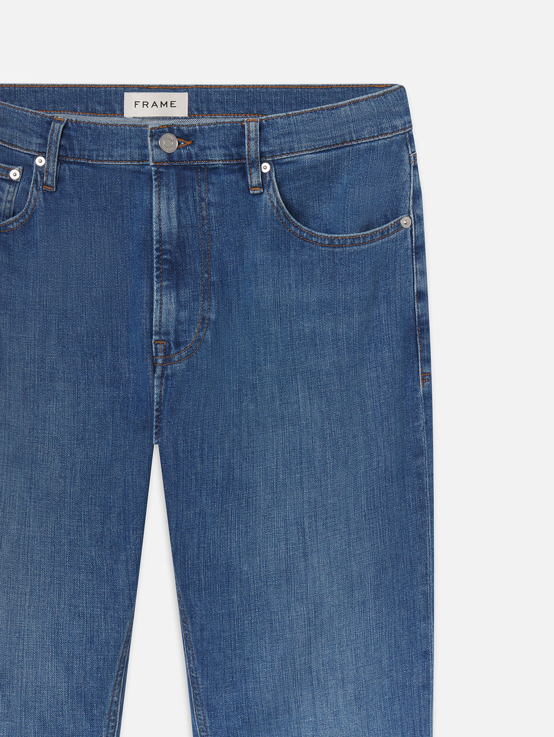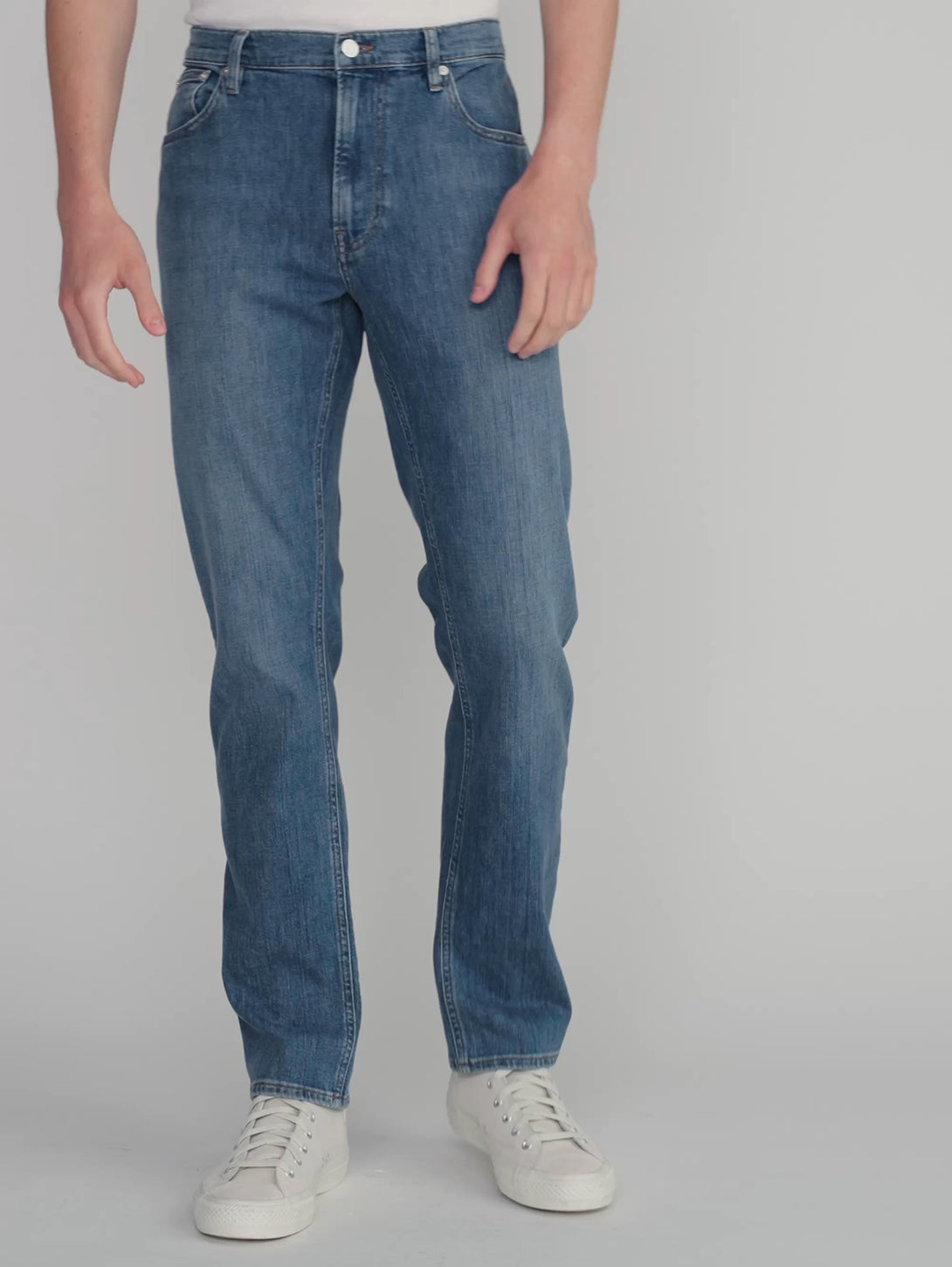 Our mid-rise, straight-leg silhouette is cut from a sustainable stretch-cotton blend using post-consumer recycled cotton and organic cotton. This 5-pocket pair easily achieves a smart, casual look in any wash.