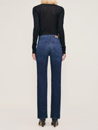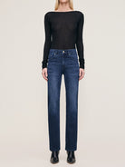 Patti is a high-rise, vintage straight fit with a 31' inseam that is relaxed through the leg for the classic look you love combined with modern comfort. Blue Cave is a mid-to-dark wash with subtle whiskering for a worn-in look. It features gold hardware, tonal stitching, a clean hem and a brown back patch.