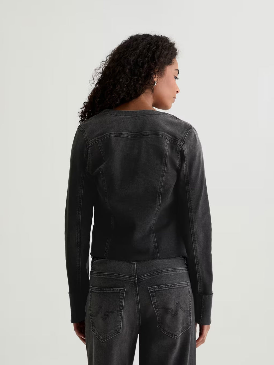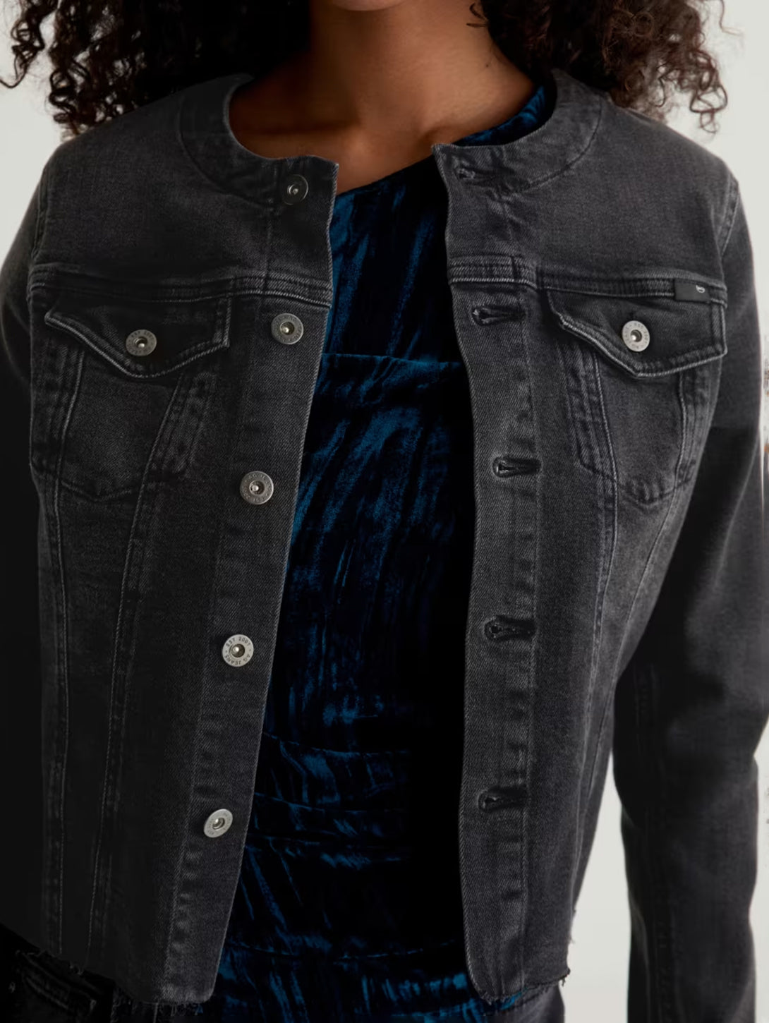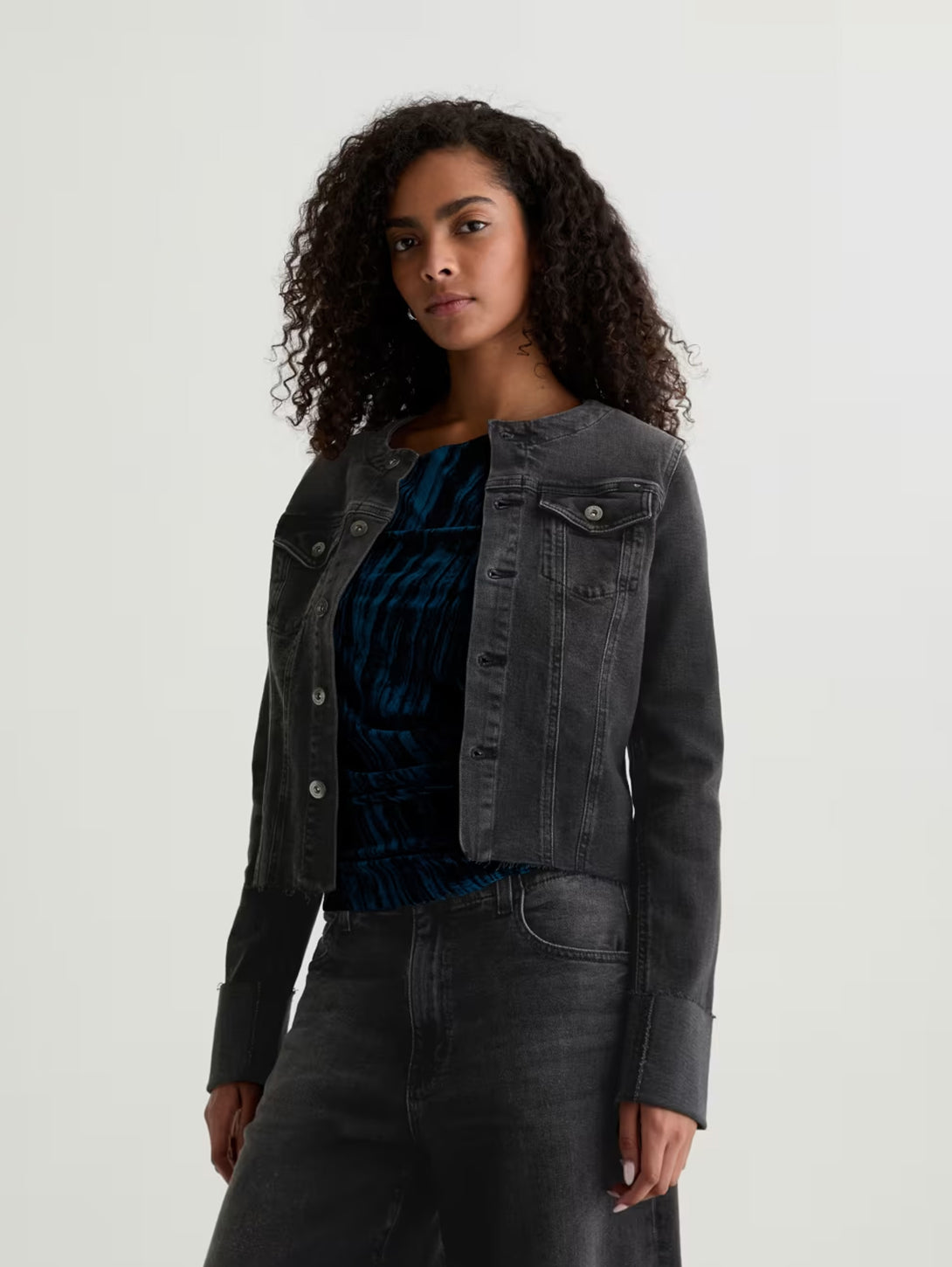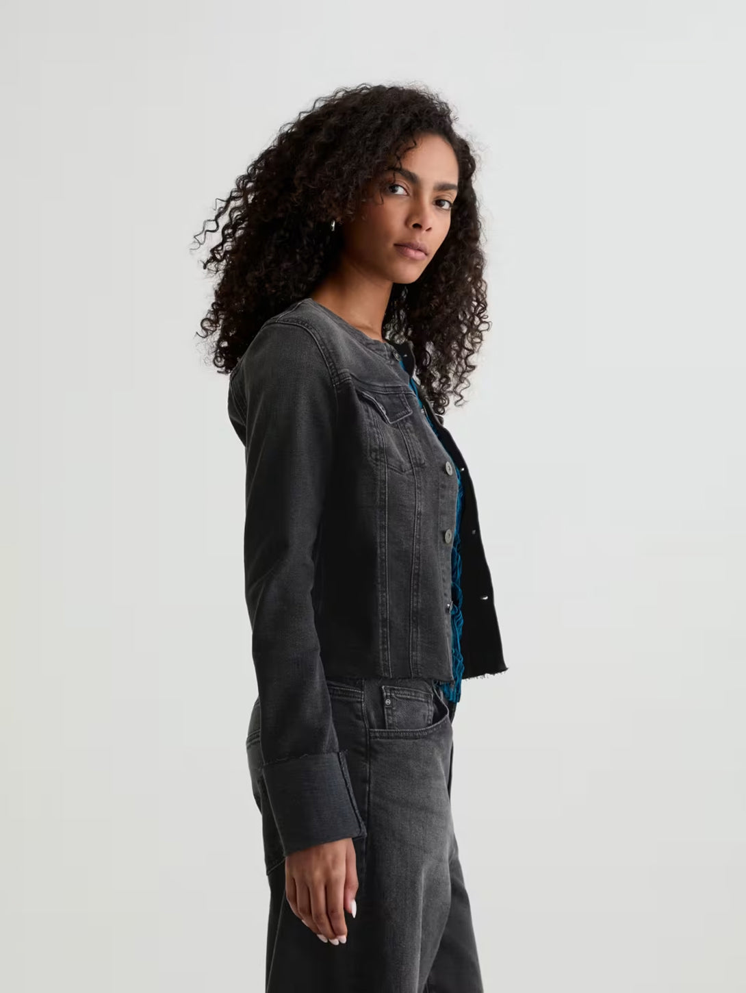 The Robyn Jacket is a collarless slim fit denim jacket. Crafted from a lightweight 9.3 oz. Midnight Comfort Stretch denim, it is done in a faded black wash for a cool, yet sophisticated aesthetic. This style features a collarless neck, raw hem, and cuffed sleeve detail.