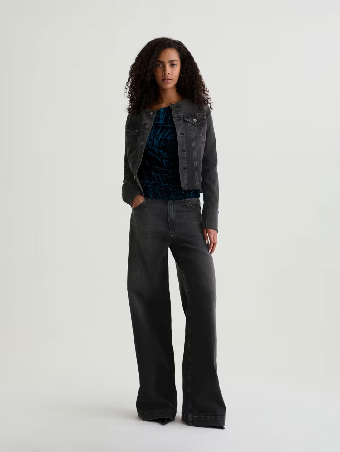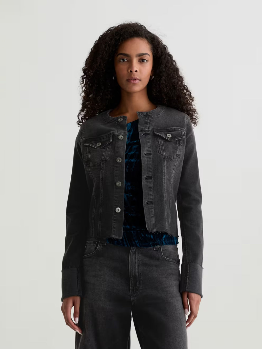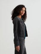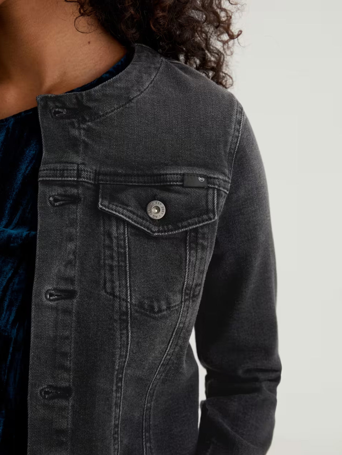 The Robyn Jacket is a collarless slim fit denim jacket. Crafted from a lightweight 9.3 oz. Midnight Comfort Stretch denim, it is done in a faded black wash for a cool, yet sophisticated aesthetic. This style features a collarless neck, raw hem, and cuffed sleeve detail.