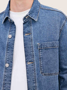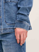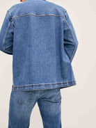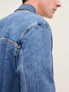 Sean is a long sleeve shirt jacket with a boxy fit, featuring a button front closure and front patch pockets. Lakewood is a mid-indigo wash with authentic character. It features silver shanks, copper rivets and khaki stitching.