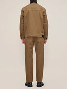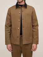 Sean is a long sleeve shirt jacket with a boxy fit, featuring a button front closure and front patch pockets. Terrain is military khaki twill with a contrasting black leather collar. It features a silver shank, copper rivets, tonal stitching, a clean hem and a black back patch.