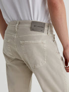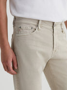 Tellis is a modern slim fit in an AG-ed™ khaki color. Fading and subtle wear along the edges emulate 7 years of authentic wear. Featuring a fitted upper block with a mid-rise waist, these five-pocket men's jeans have slim legs that taper down to the ankle in 8.7 oz. Hyper Soft Bull Denim, a velvety-soft left-hand twill from Japan. This AG Cloud Soft Denim™ fabric has special construction that allows the yarns to gently relax and untwist for a supple feel that gets softer with every wear. Dual-elastic performance fibers offer elevated stretch and recovery.