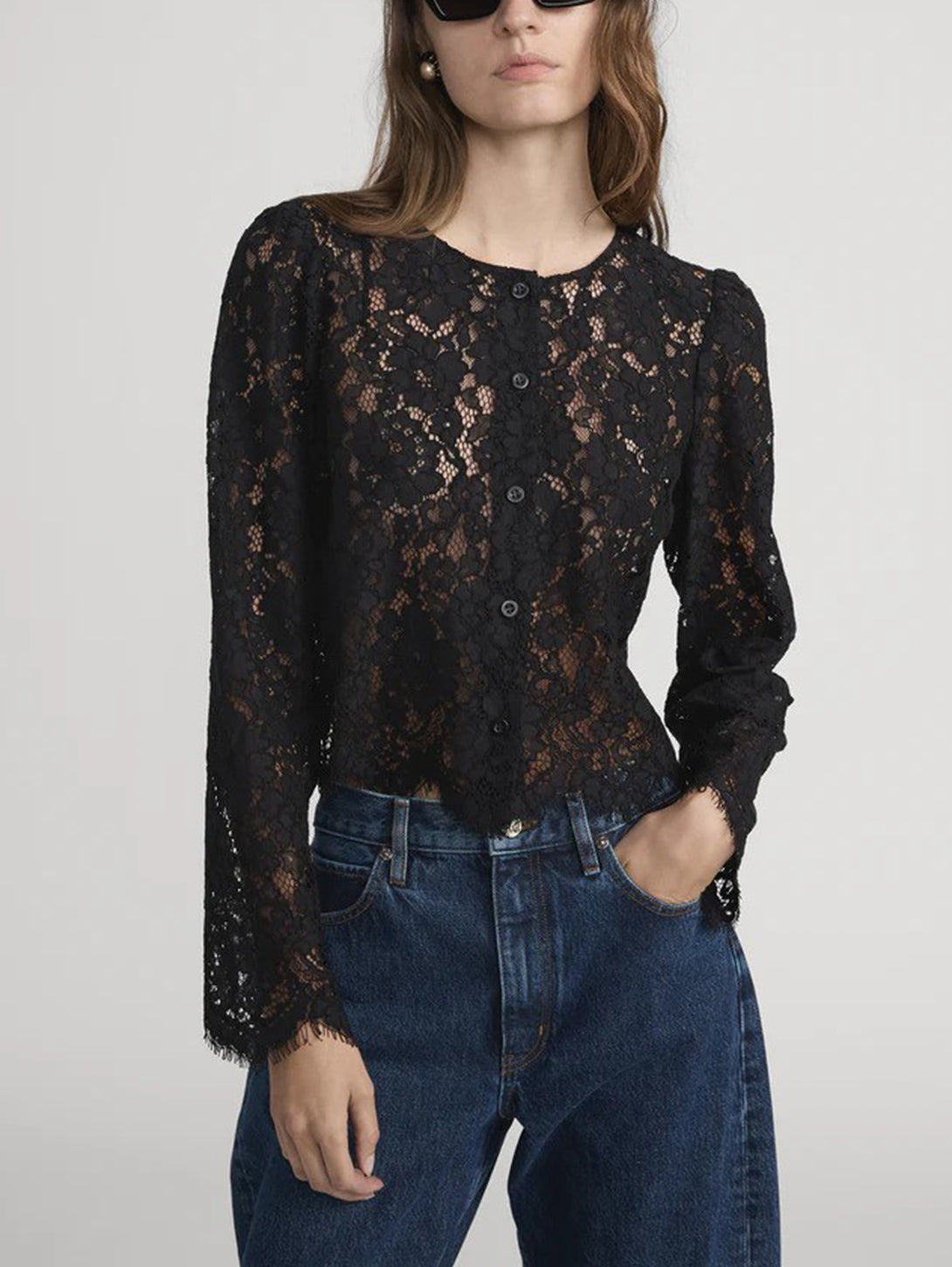 This effortlessly polished blouse is crafted in heavy lace for a modern, structured silhouette, and finished with femme scalloped edges. Waistband-grazing, with full-length sleeves and subtle button closures.